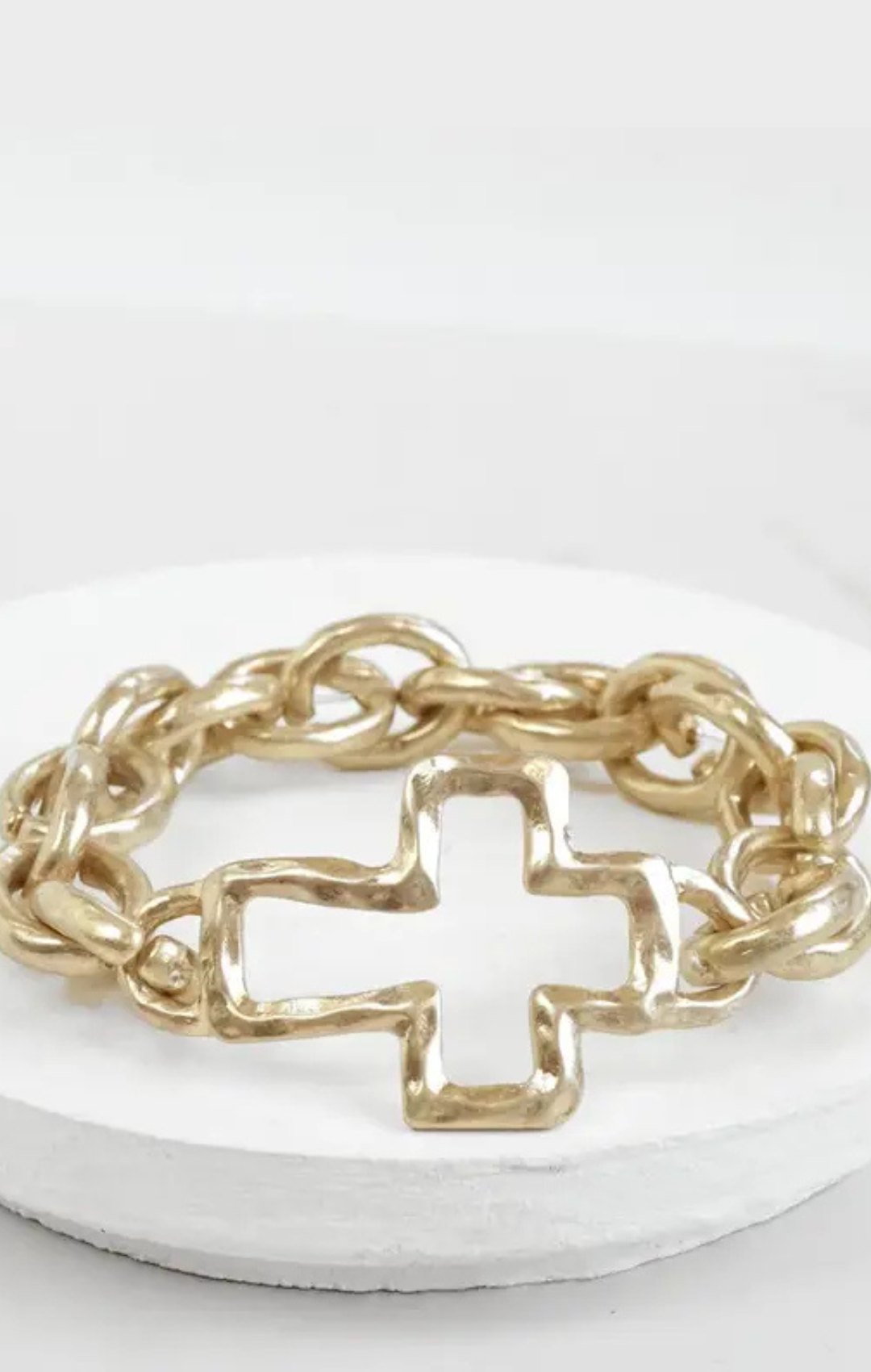 Experience luxury and elegance with our Chunky stretchy hammered chain link. This worn gold Cross bracelet is a perfect statement piece and can easily be layered with other pieces. Its unique design and stretchy material provide both style and comfort, making it the perfect addition to any outfit.
