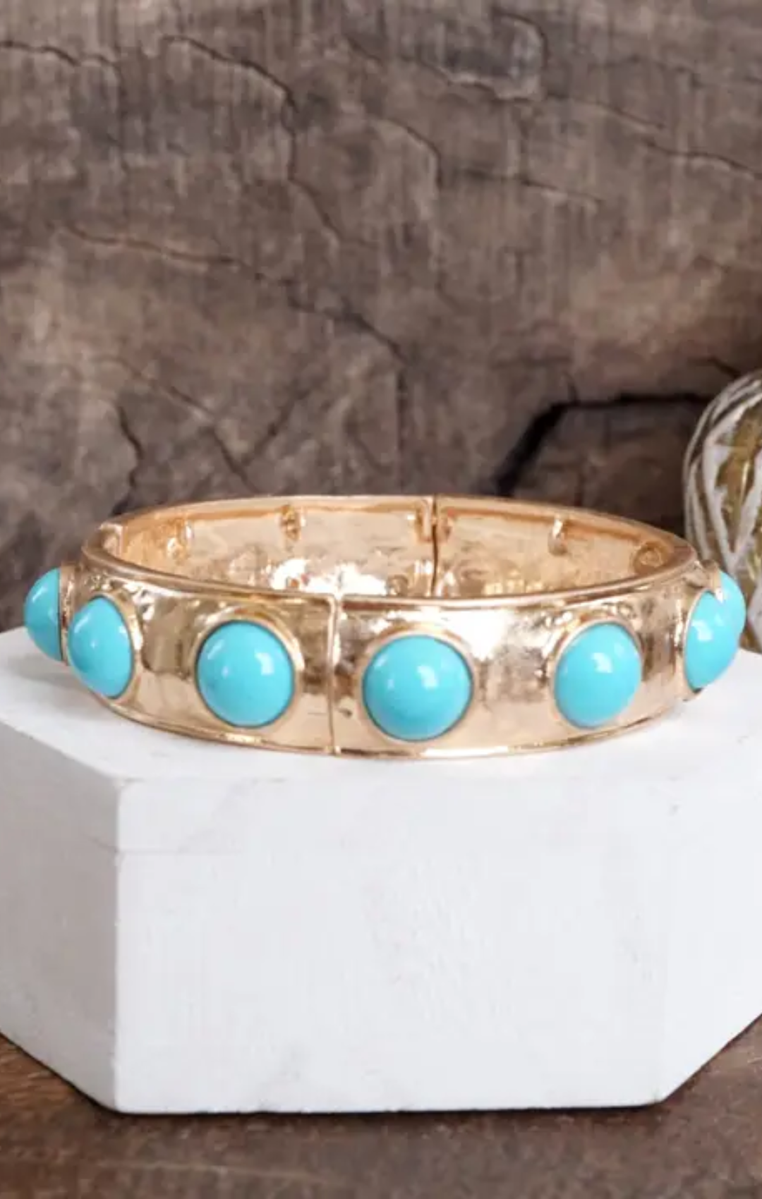 A chic and stylish bangle designed to make a statement. Crafted with a textured finish, faux acrylic turquoise cabochons, this stretchy piece combines bold elegance with everyday versatility.