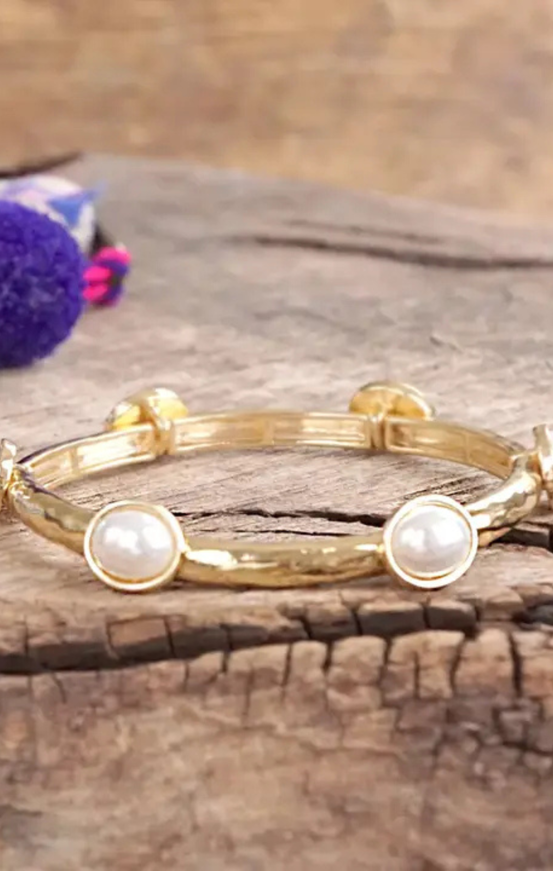 A soft shimmer meets desert soul. This stretchy station bangle features six oval pearl cabochons set evenly around a lightly hammered band—balancing rustic charm with an effortless fit. Whether you’re stacking it up or letting it shine solo, it brings an earthy elegance to your everyday style.