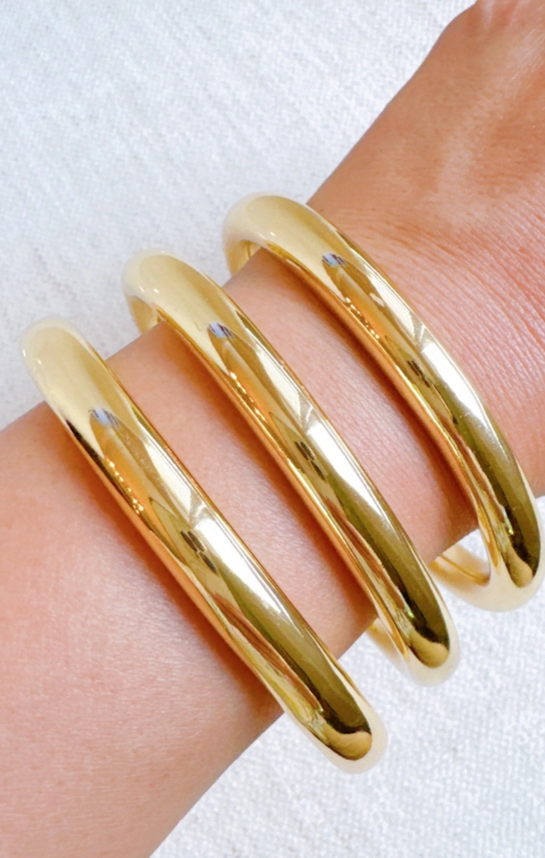 A timeless and versatile bangle set featuring five glossy gold-tone bangles with a smooth, polished finish. Perfect for layering or wearing solo to add a touch of shine to any outfit. Lightweight and durable for everyday elegance.