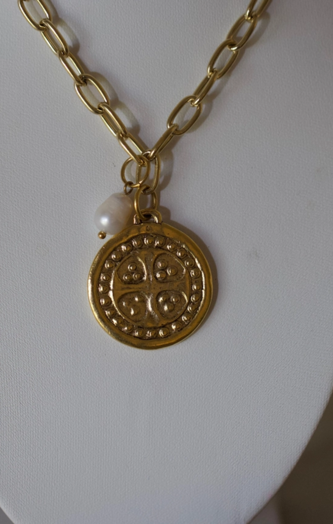 Vintage charm meets timeless faith in the Nora Cross Coin Necklace. This standout piece features a delicately antiqued 12k gold-dipped coin etched with a dotted cross design, paired with a single dainty pearl for a touch of grace. The 16-inch chain with a 2-inch extender makes it perfect for layering or wearing solo, adding meaning and style to any neckline. Crafted from stainless steel for lasting wear and finished in antiqued 12k gold, this necklace blends beauty and durability for everyday inspiration.