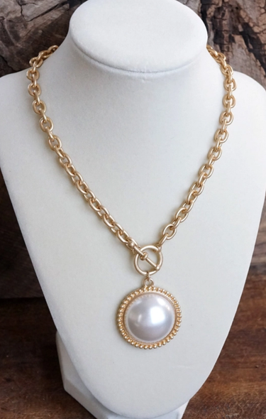 A unique blend of boldness and elegance, this Pearl Statement Chain Necklace in worn gold tone is sure to turn heads. With its chunky rolo chain and striking half faux pearl pendant, this piece offers vintage-inspired charm with a modern twist. The decorative front toggle closure makes it easy to wear, while the extender provides versatility in length. Perfect for those who love to make a statement, this necklace is both stylish and timeless.
