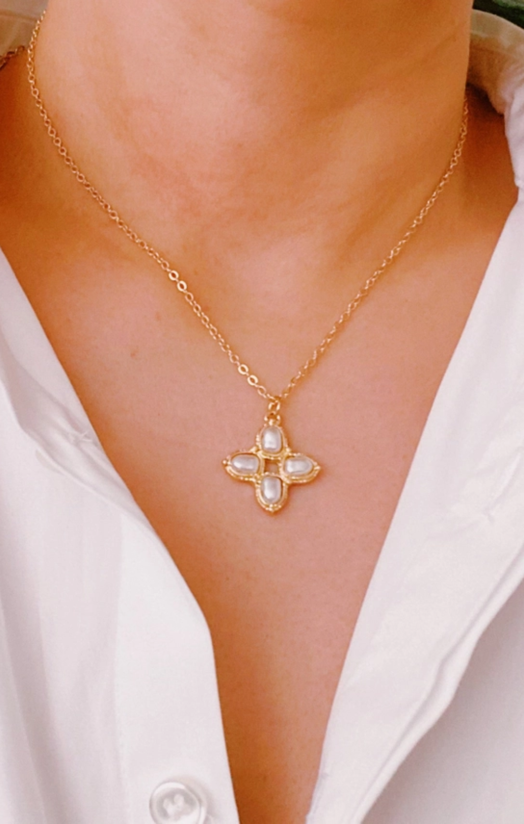 This Square Pearl Cross Necklace features a unique cross shape and classic pearl detailing, giving it a timeless and elegant look. Its versatile design allows for layering, making it a perfect addition to any outfit.
