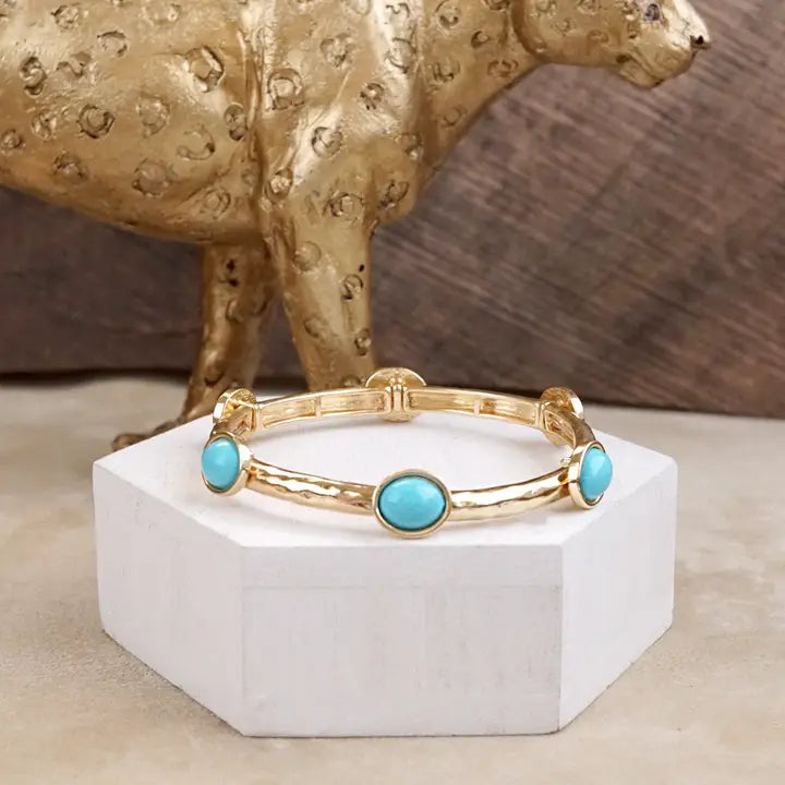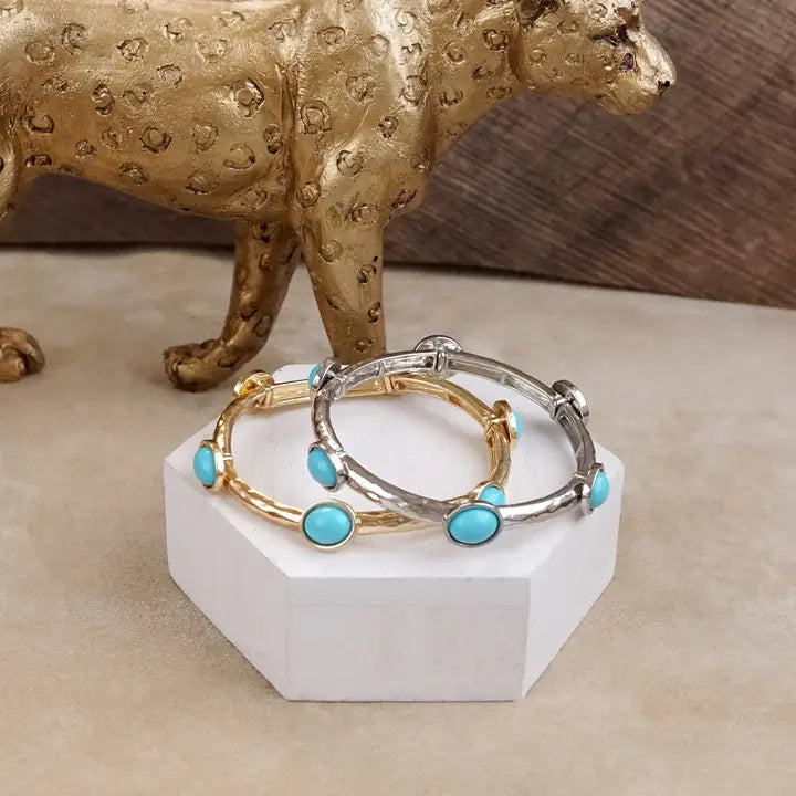 A soft shimmer meets desert soul. This stretchy station bangle features six oval turquoise cabochons set evenly around a lightly hammered band—balancing rustic charm with an effortless fit. Whether you’re stacking it up or letting it shine solo, it brings an earthy elegance to your everyday style.