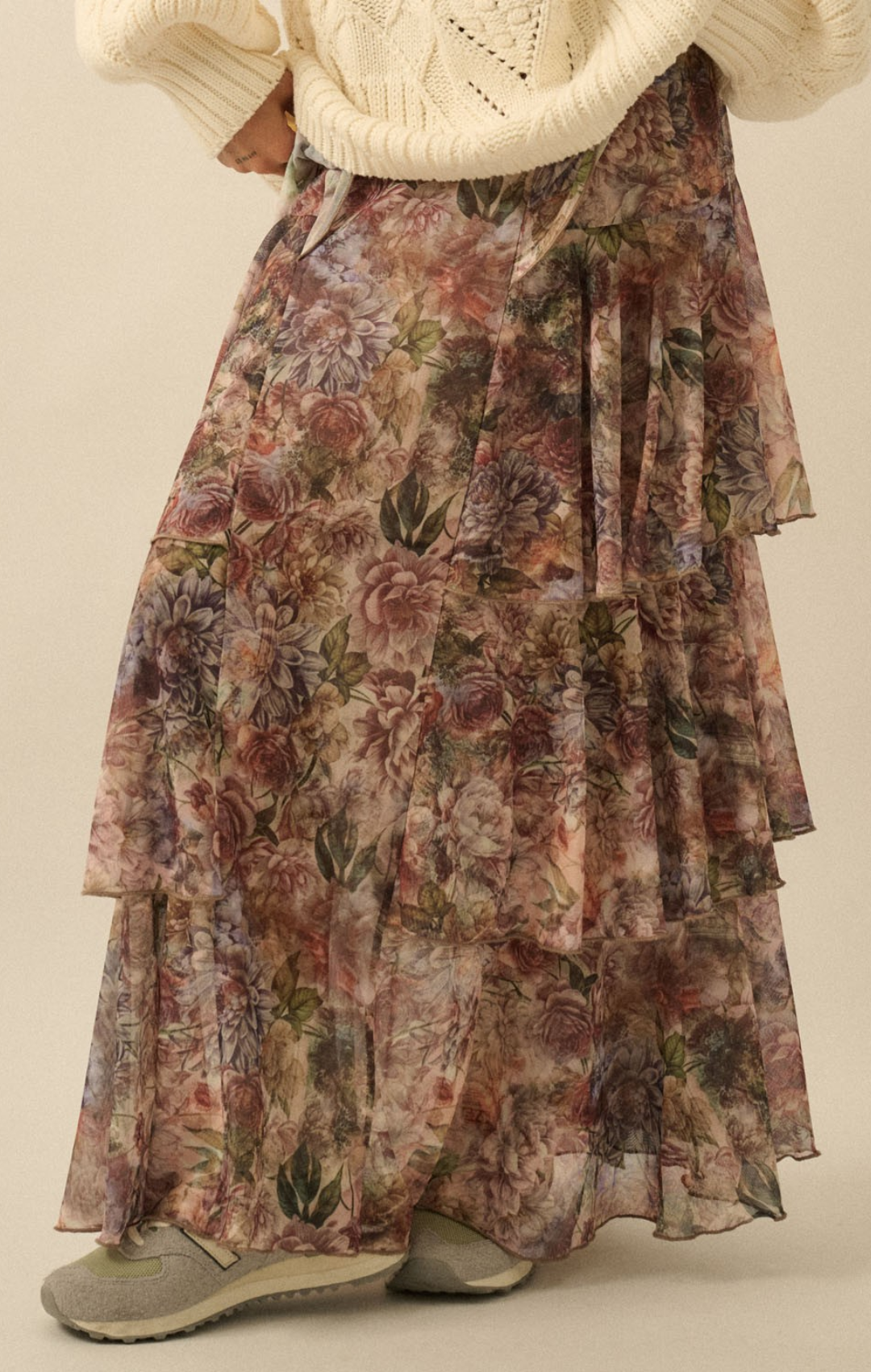 Elevate your wardrobe with this Floral-print Mesh Tiered Side-ruffle Maxi Skirt. Designed with delicate mesh layers and a graceful side ruffle, it offers a flowing silhouette that enhances every step. The vibrant floral print brings a fresh, feminine touch, making it perfect for any occasion, from casual outings to special events. Comfortable and stylish, this maxi skirt ensures you stand out with effortless elegance.