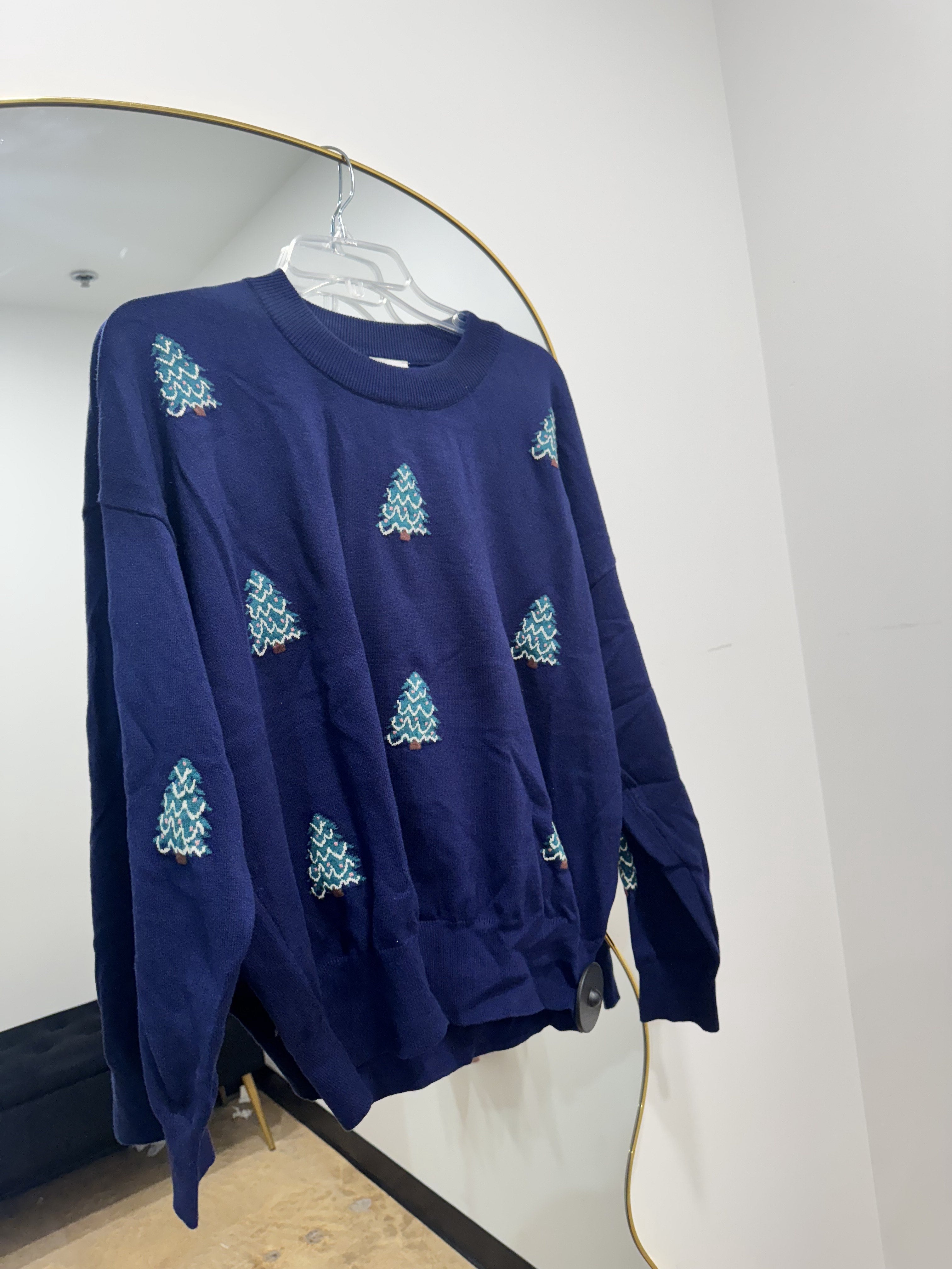 Celebrate the season in style with this navy Christmas Tree Sweater, adorned with charming Christmas tree patterns. Its rich navy base highlights the festive design, making it a cozy and eye-catching choice for holiday gatherings. Perfect for adding warmth and festive spirit to any outfit, this sweater keeps you comfortable while spreading merry vibes wherever you go.