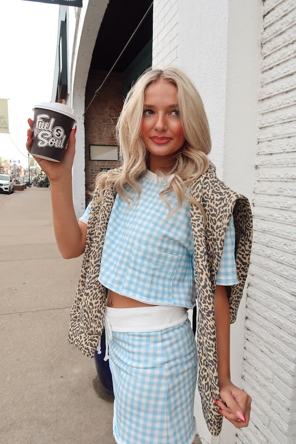 Gingham Cropped Tee And Skirt Set Timeless charm meets modern ease with this gingham two-piece set. The cropped tee hits just right at the waist, while the coordinating skirt balances the proportions with effortless grace. Gingham's inherent versatility means you can wear these pieces separately or together—dress up with accessories or keep it casual for weekend ease. The classic pattern transcends seasons, making this set a reliable choice whether you're layering for cooler months or going bare-armed in warmer weather. A wardrobe essential that proves simple coordination can feel anything but ordinary.