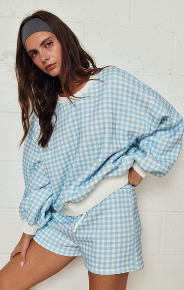 Relax in style with this effortlessly chic lounge set. Featuring a soft gingham fabric, the oversized top and drawstring shorts deliver comfort without compromise. Ribbed details and a relaxed silhouette make this set ideal for lounging at home or transitioning into casual outings. A playful yet modern essential that brings ease to your everyday wardrobe.