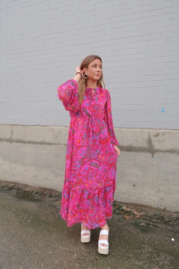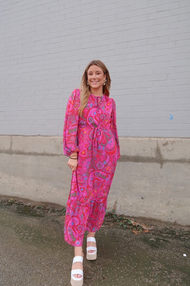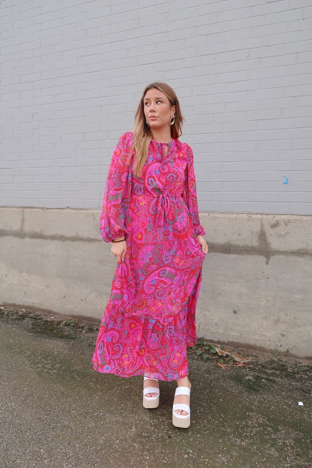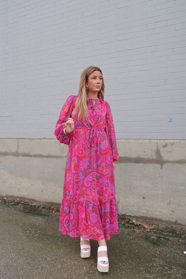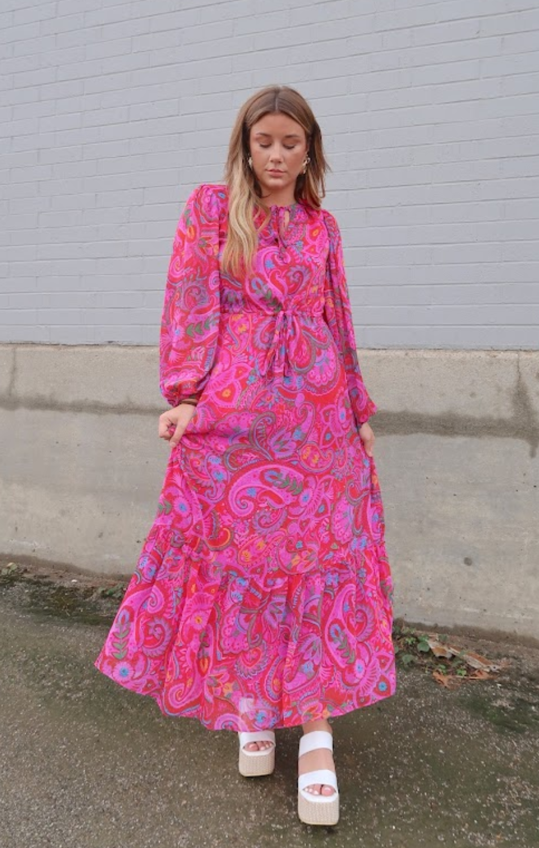 Embrace the beauty of every season in our Anais Floral Mauder Balloon Maxi Dress. Features a split neckline with a tie detail that's framed by sheer, long balloon sleeves. An elastic band at the waist creates shape, topping a gathered flowy single tier skirt. Leave your hair down or in a bun for a cute look.