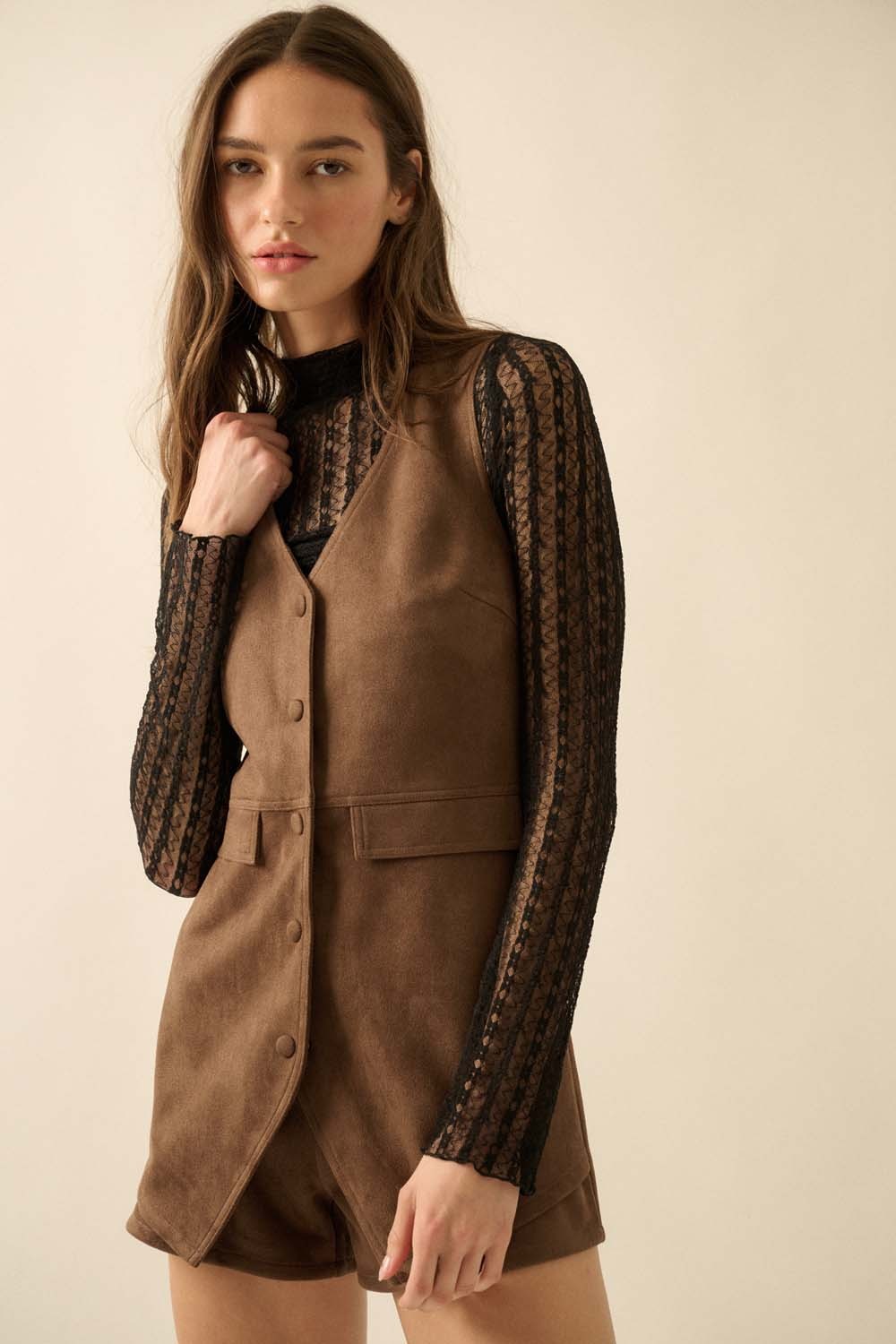 This faux suede romper offers a chic, fitted silhouette with a vest-style top and flattering V neckline. Featuring a convenient snap-button front closure and decorative pocket flaps, it combines style with subtle detail. Sleeveless and thigh-length, the attached shorts provide comfort and ease, making this romper a perfect choice for effortless, fashionable looks.