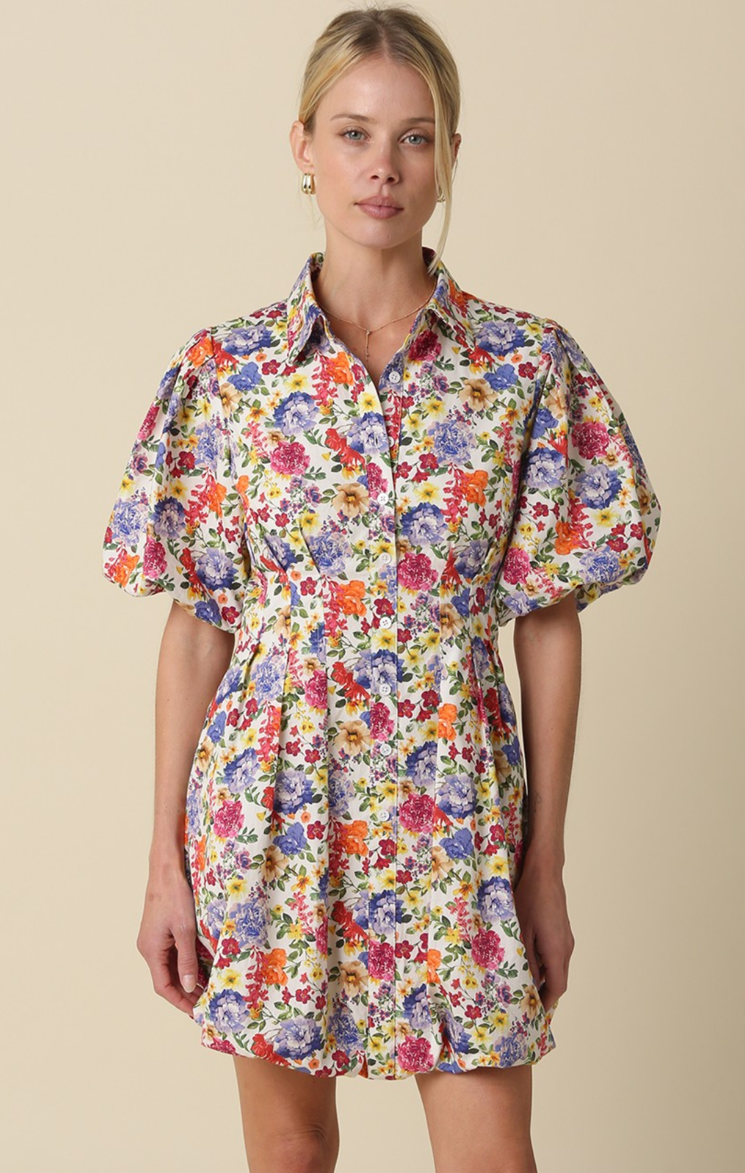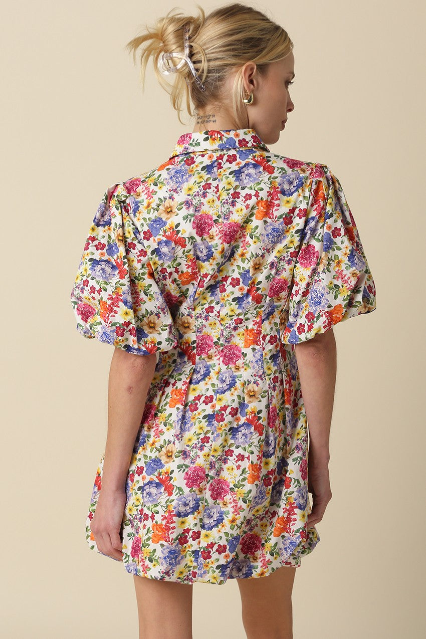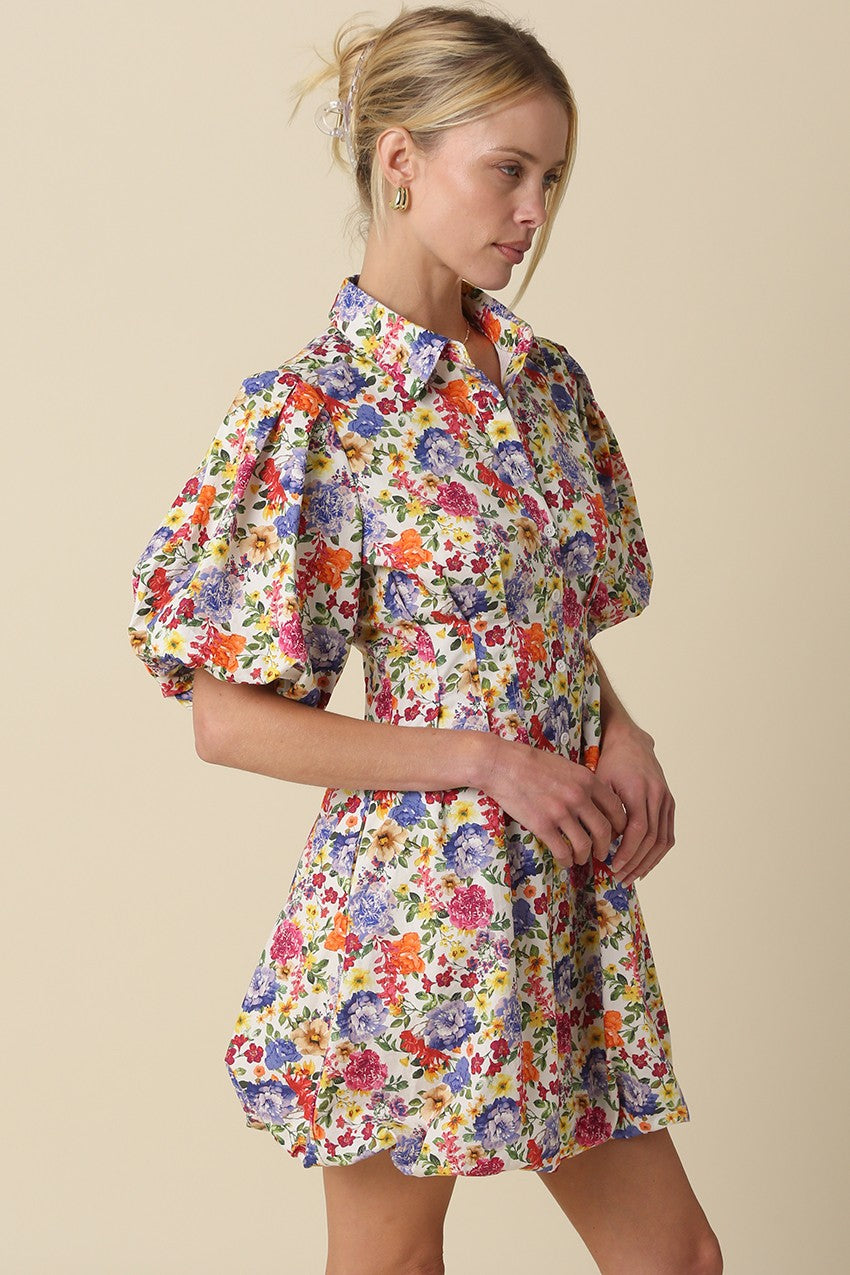 Our Sierra Floral Puff-Sleeve Shirt Dress features a button front with classic shirt collar and front button closure for a tailored look, and short puff sleeves with structured shoulder volume and bubble hem for a playful look.