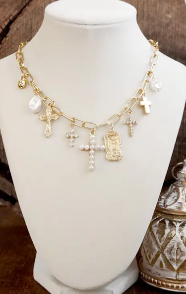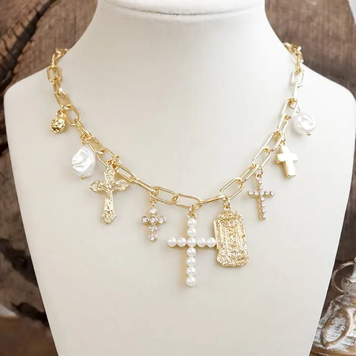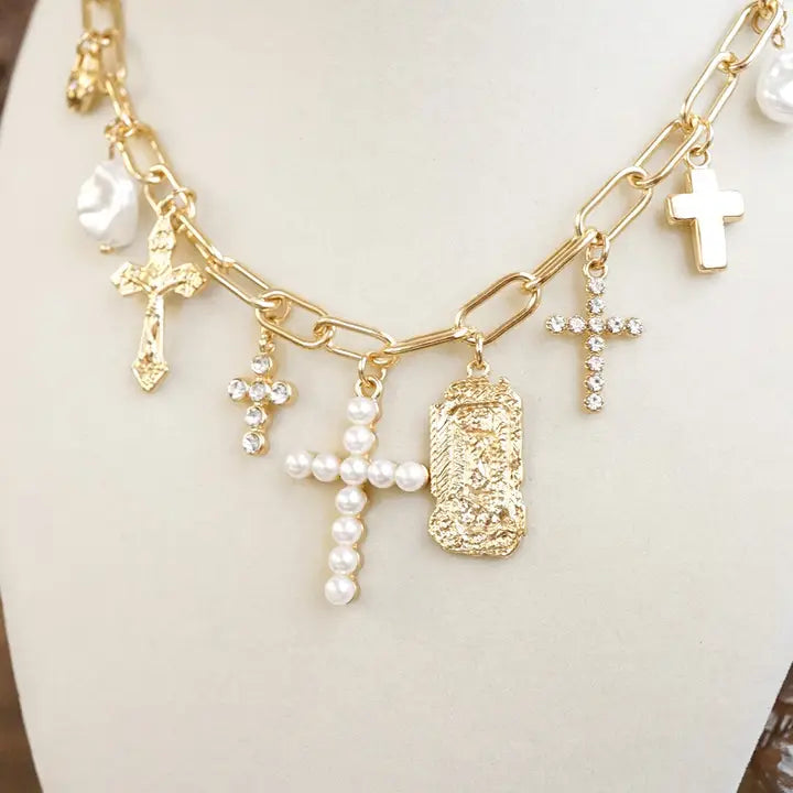 A tribute to meaningful layers—this golden beauty features a curated mix of nine delicate charms, from mini crosses to softly pearlized drops, each dancing along a golden paperclip chain. Full of story and shimmer, this piece radiates soul and style in equal measure.