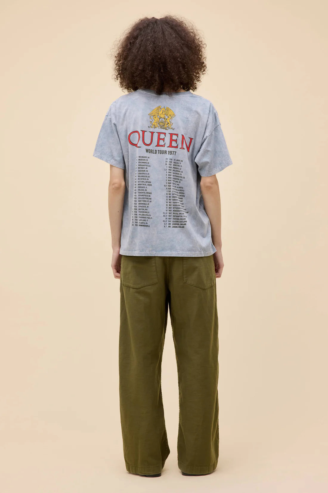 A true merch truck find, this acid wash Merch Tee tributes Queen's 1977 World Tour with their logo stamped on the left chest and the tour details on the back.
