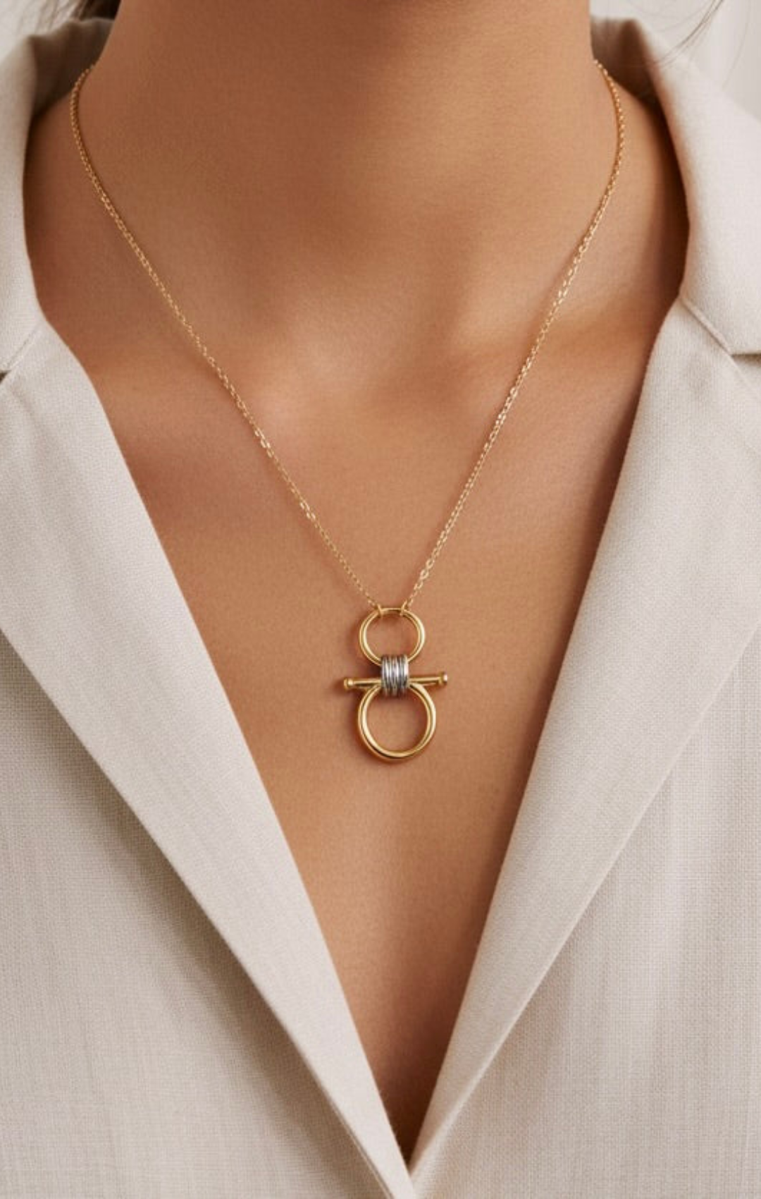 A gold chain necklace featuring an equestrian-inspired mixed metal statement at the center. Bold yet refined, this piece adds a confident, modern edge to any look.