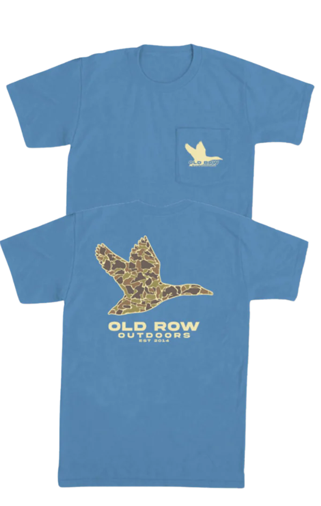 Designed for the avid outdoorsman, the men's Old Row Outdoors Flying Duck Pocket T-Shirt in washed denim blue blends style and function with everyday comfort. This men's short sleeve graphic tee is printed on a Comfort Colors t-shirt which is crafted from 100% ring spun cotton. It boasts a soft washed garment dyed fabric that's got that worn-in feel right out of the box, meaning it's certain to become a favorite in your tee rotation. The front features a chest pocket with flying duck and on the back is a custom graphic of a camo colored flying duck.