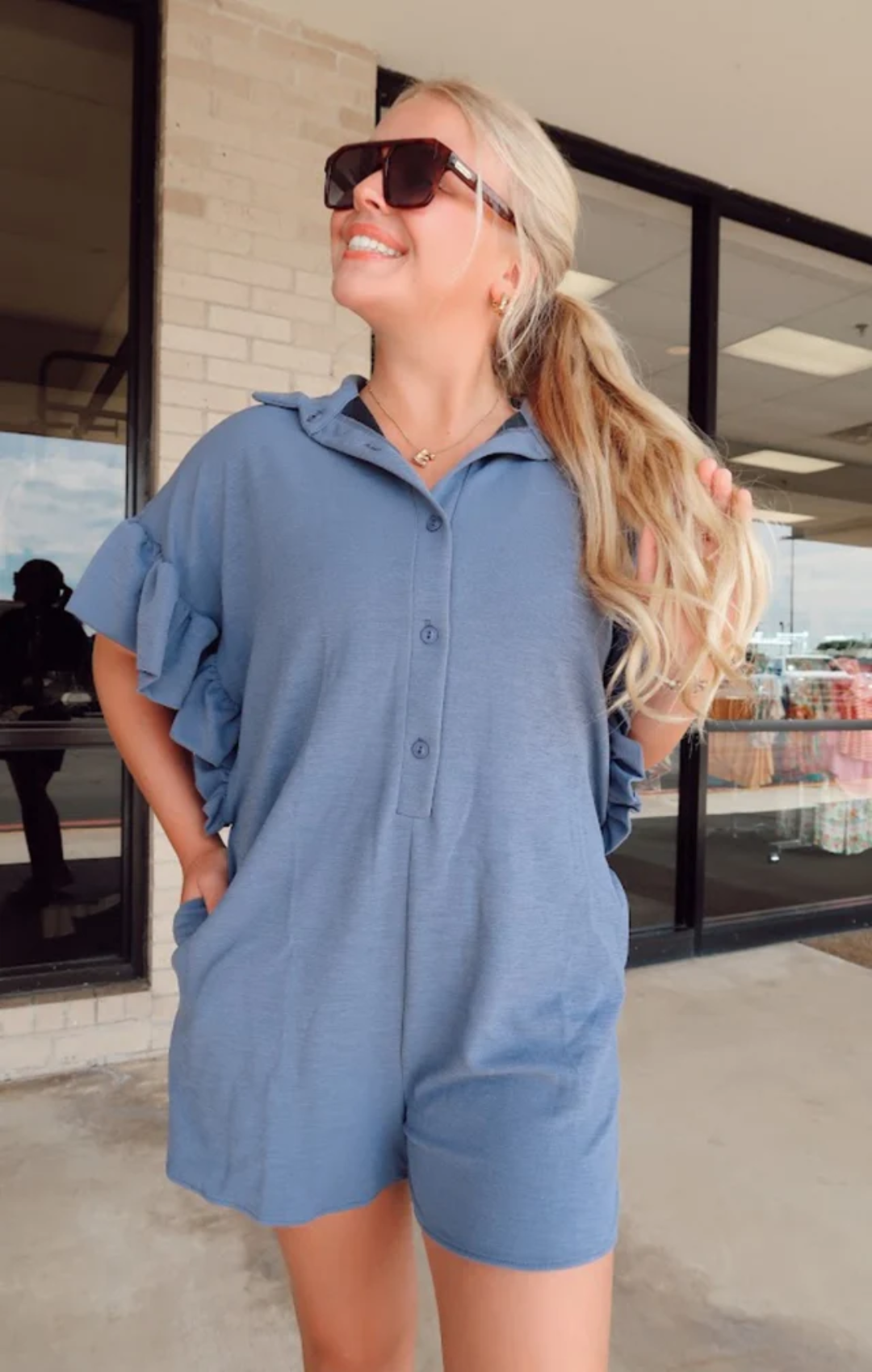 Get ready to make a statement with our Button Up Ruffle Sleeve Romper! This playful and stylish romper features a collared neckline and boxy ruffled sleeves for a unique twist on a classic design. Made with a soft knit material, it's the perfect combination of comfort and fashion. Button up and rock this romper with confidence!