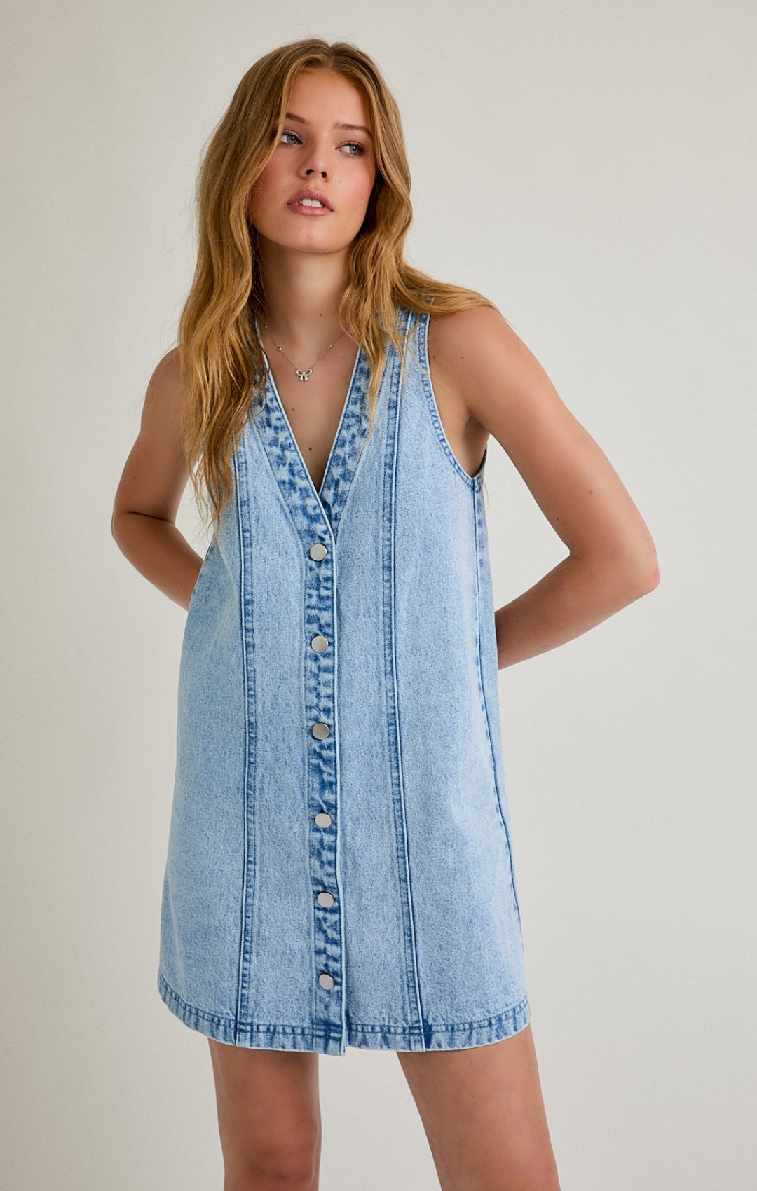 Denim Sleeveless Button Down Dress Effortless versatility meets timeless style with this denim sleeveless button-down dress. The classic indigo wash and structured silhouette transition seamlessly from casual weekends to elevated occasions—layer it over a tee or wear solo for instant polish. Functional front buttons and a flattering cut make it a wardrobe essential that works harder than most pieces. Perfect for anyone seeking a dependable, seasonless staple that pairs with everything from sneakers to heels.