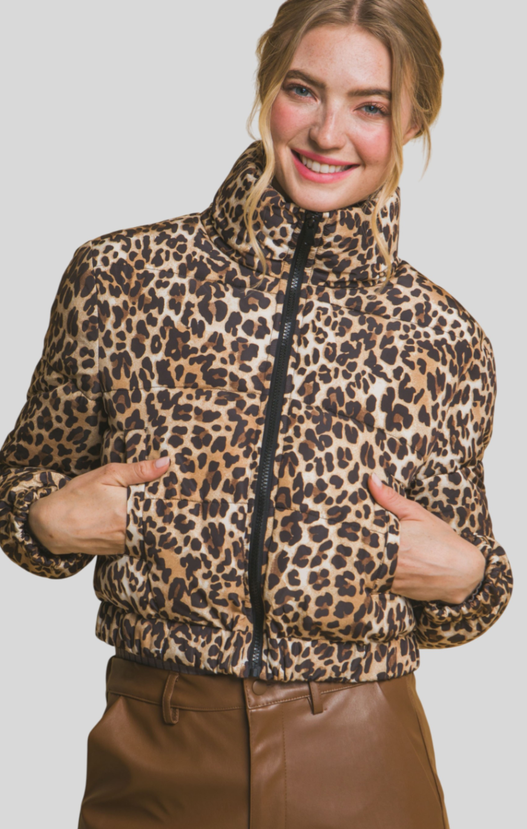 Turn heads and stay warm with the Leopard Print Puffer Jacket. Featuring a bold animal print and insulating padding, this jacket combines fierce style with everyday comfort. Perfect for chilly days, it adds a vibrant edge to your wardrobe while keeping you cozy and protected against the elements.