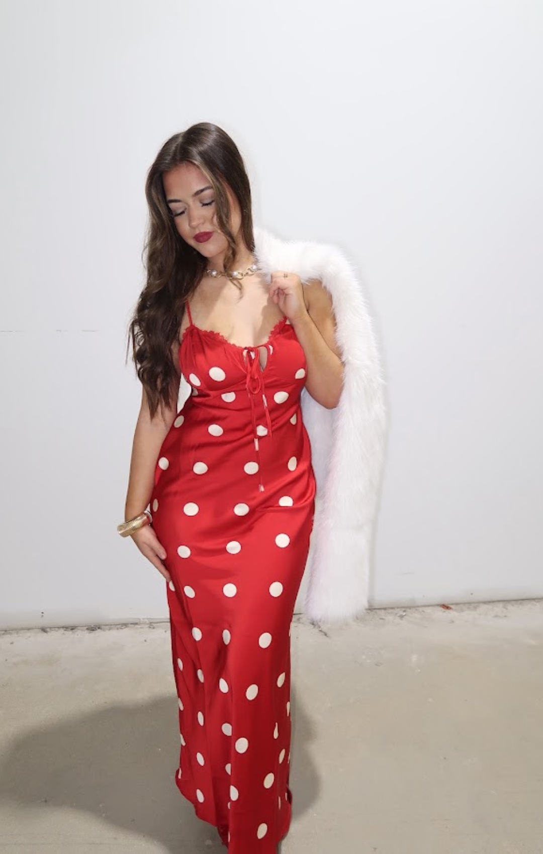 Polka Dot Maxi Dress Effortless elegance meets timeless charm in this polka dot maxi dress—a versatile wardrobe essential that transitions seamlessly from day to evening. The classic dot pattern adds playful sophistication, while the flowing maxi silhouette flatters every frame and moves with graceful ease. Perfect for brunches, garden parties, or casual outings, this dress pairs beautifully with sandals, heels, or sneakers depending on your mood. Crafted for comfort and style, it's the one piece you'll reach for again and again.