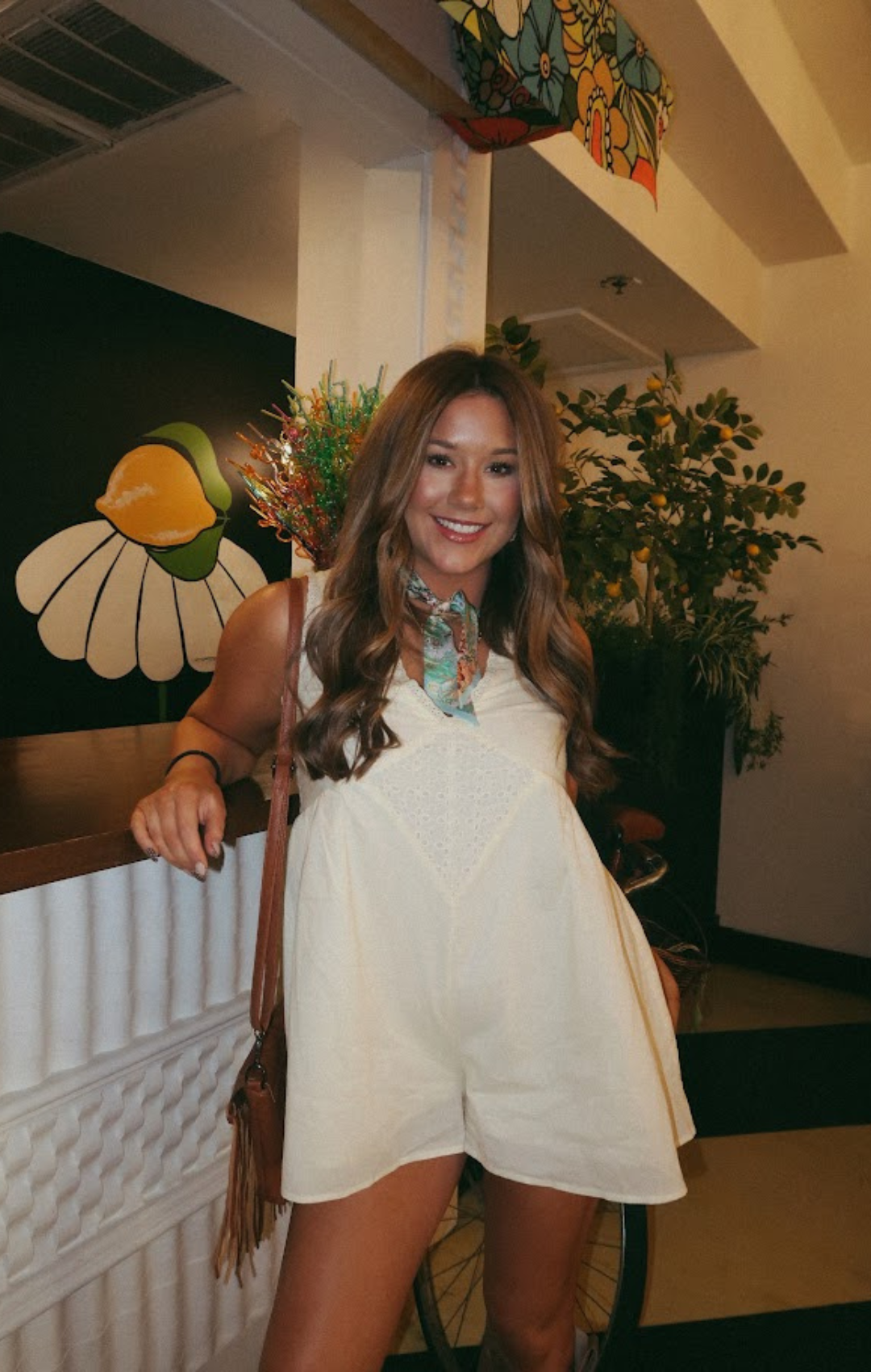 Step into effortless charm with this delightful scalloped eyelet voile romper. The intricate eyelet detailing and scalloped edges create a romantic, feminine aesthetic that turns heads, while the lightweight voile fabric keeps you cool and comfortable all day long. This one-piece wonder eliminates styling decisions—simply slip it on and go, whether you're heading to a garden party, weekend brunch, or casual getaway. The playful silhouette flatters your figure while the breathable construction ensures you stay fresh from morning to evening. Pair it with sandals and a crossbody bag for an instantly polished look that feels anything but overdone. A versatile piece that proves sometimes one garment is all you need.