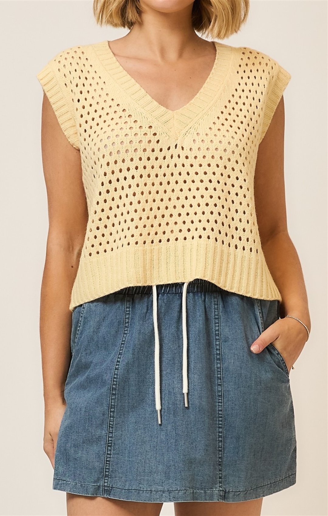 Open Knit V Neck Sweater Vest Layer effortlessly with this lightweight open knit sweater vest. The relaxed V-neckline and breathable construction make it perfect for transitional seasons, while the versatile neutral tones pair seamlessly with any wardrobe staple. Wear it solo over a tee or dress it up layered under a jacket for added dimension and style.