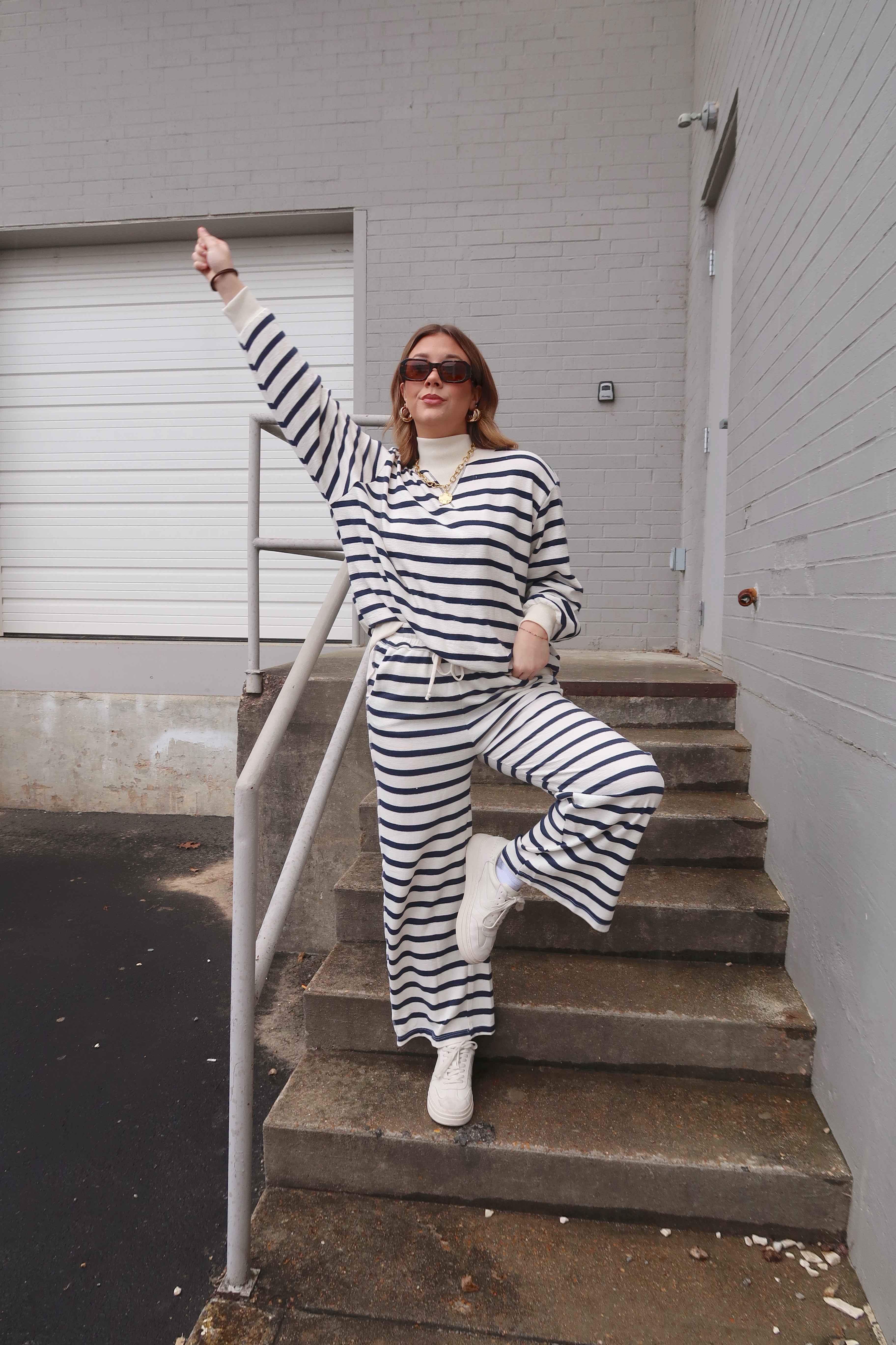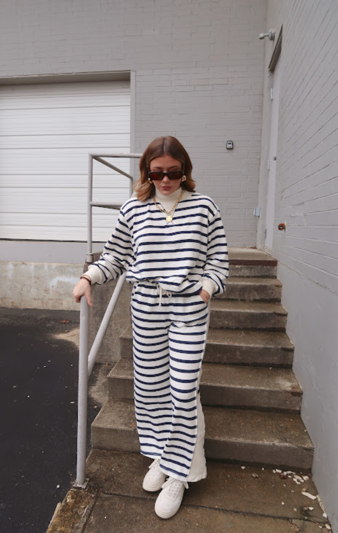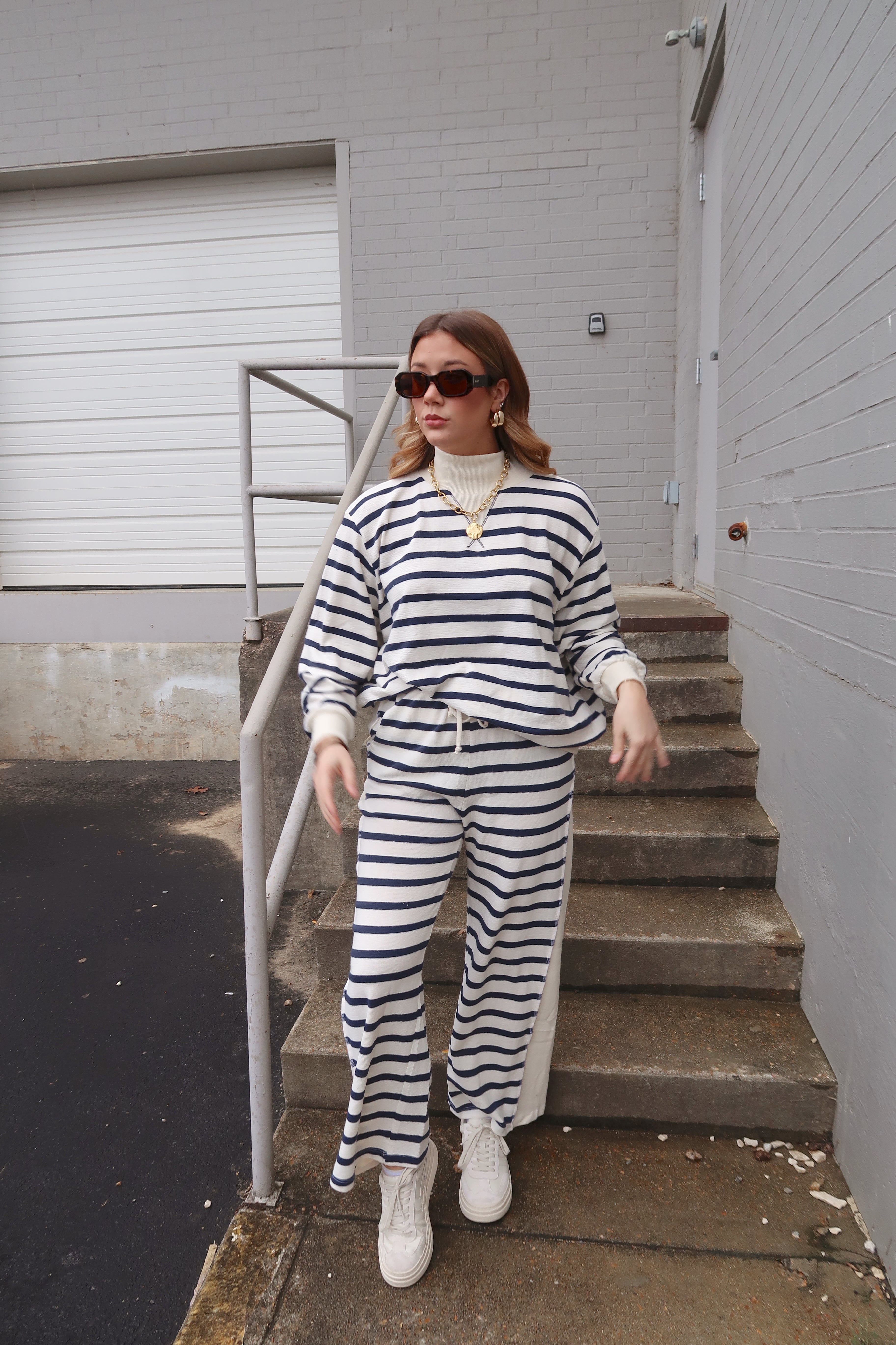 Upgrade your loungewear with our Bethany Striped Sweatpants! Made with soft, durable fabric and featuring a stylish striped design, you'll feel comfortable and look great whether you're lounging at home or running errands. Stay cozy and chic with these must-have sweatpants!
