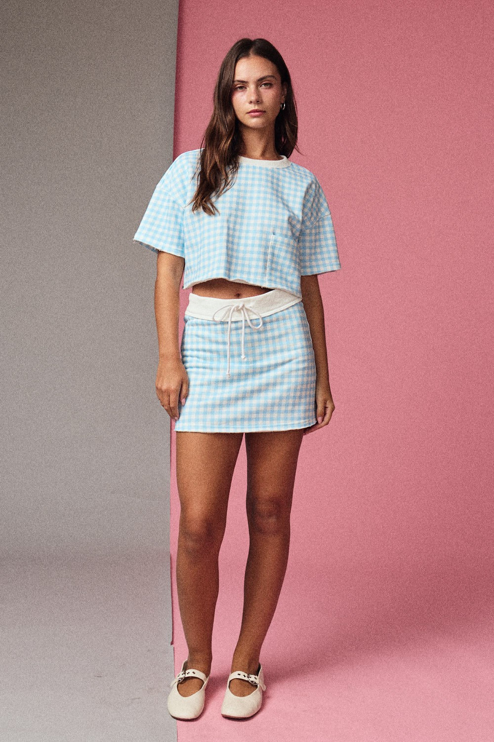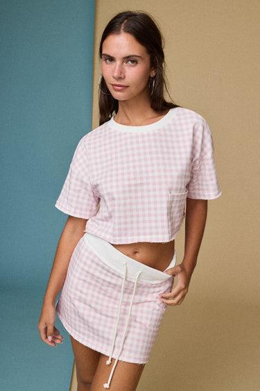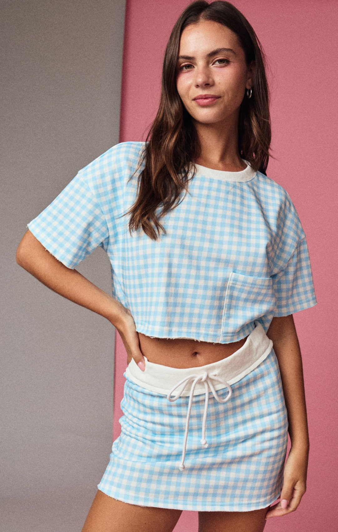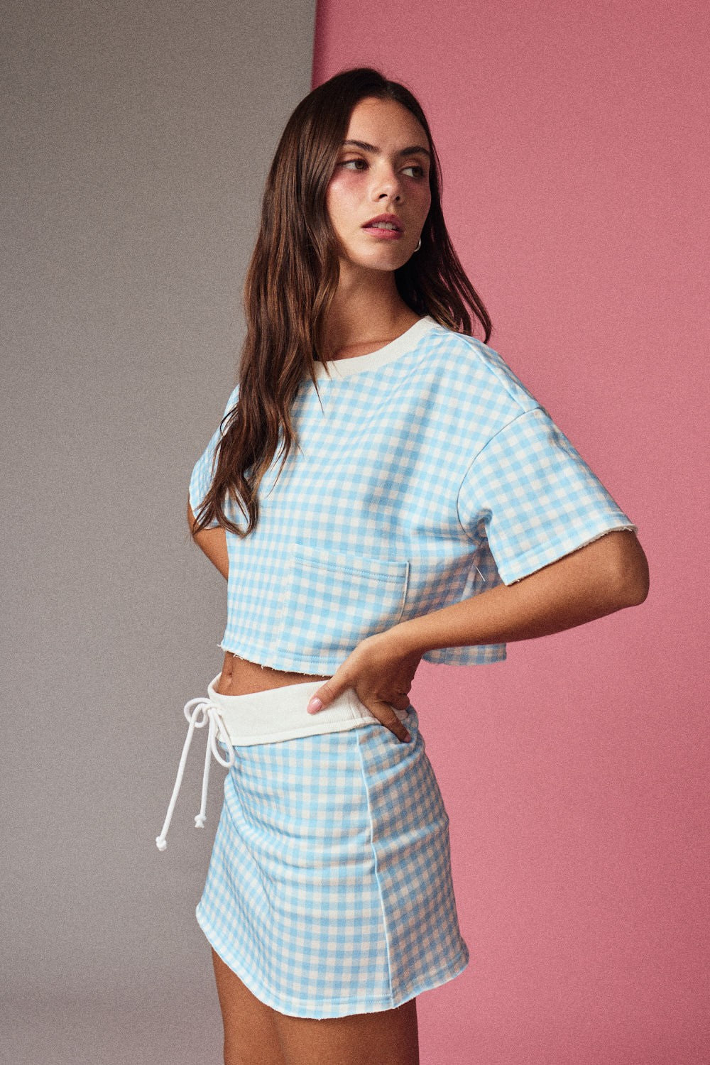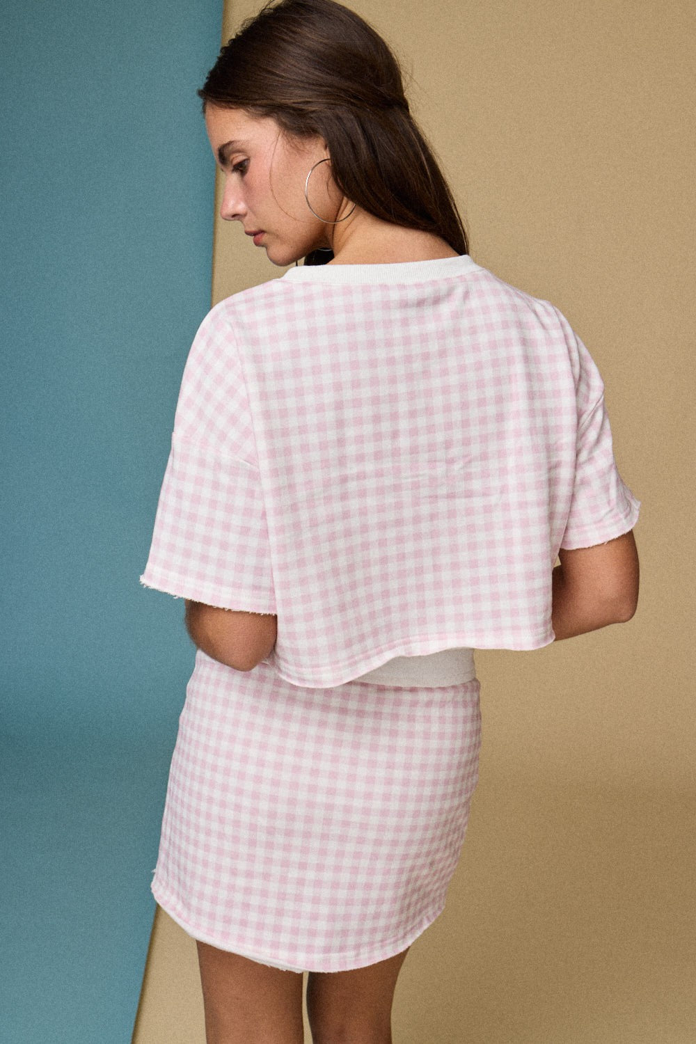 Gingham Cropped Tee And Skirt Set Timeless charm meets modern ease with this gingham two-piece set. The cropped tee hits just right at the waist, while the coordinating skirt balances the proportions with effortless grace. Gingham's inherent versatility means you can wear these pieces separately or together—dress up with accessories or keep it casual for weekend ease. The classic pattern transcends seasons, making this set a reliable choice whether you're layering for cooler months or going bare-armed in warmer weather. A wardrobe essential that proves simple coordination can feel anything but ordinary.