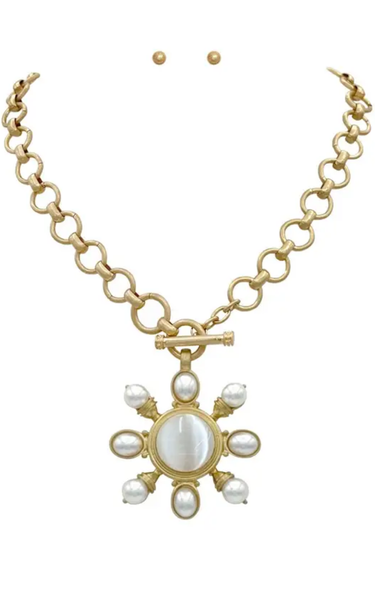 Embrace feminine sophistication with this enchanting Flower Pearl Circle Link Necklace. Delicate floral motifs intertwine with lustrous pearls and circular metal links, creating a piece that's both romantic and refined. This necklace captures the essence of timeless elegance while offering modern versatility—wear it to elevate casual outfits or complement your most formal occasions. The intricate design draws admiring glances without overwhelming your look, making it the perfect everyday luxury. Whether you're celebrating a special moment or simply treating yourself, this necklace delivers the grace and beauty you deserve.