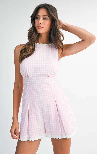 Elevate your casual style with this gingham plaid lace trim detail romper—where preppy meets feminine in perfect harmony. The delicate lace trim softens the structured gingham pattern, creating a balanced look that feels both polished and approachable. Ideal for summer outings, garden parties, or any occasion calling for effortless charm, this one-piece does the styling work for you. Dress it up with heels or keep it grounded with sneakers—either way, you'll look intentional and put-together.