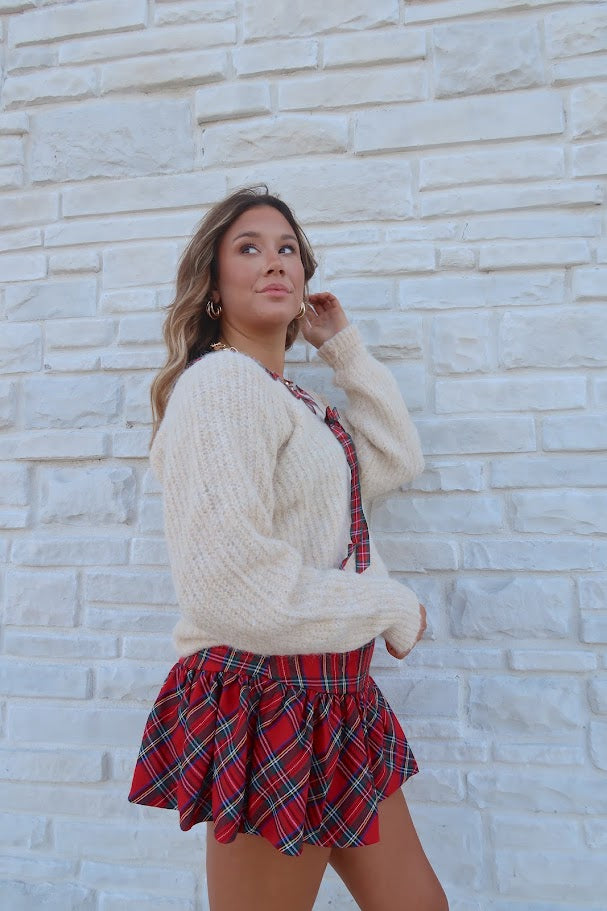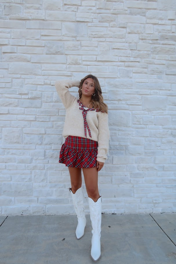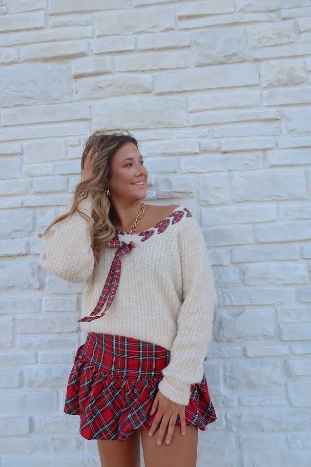 Embrace festive charm with this Holiday Christmas Plaid Tape Braided Ribbon V Neck Sweater Top. Featuring a stylish V neck and unique braided ribbon detailing, it combines comfort with holiday spirit. Perfect for seasonal gatherings, this sweater adds a warm, cheerful touch to your wardrobe while keeping you cozy and elegant. Celebrate the season in style and make every moment merry and bright.