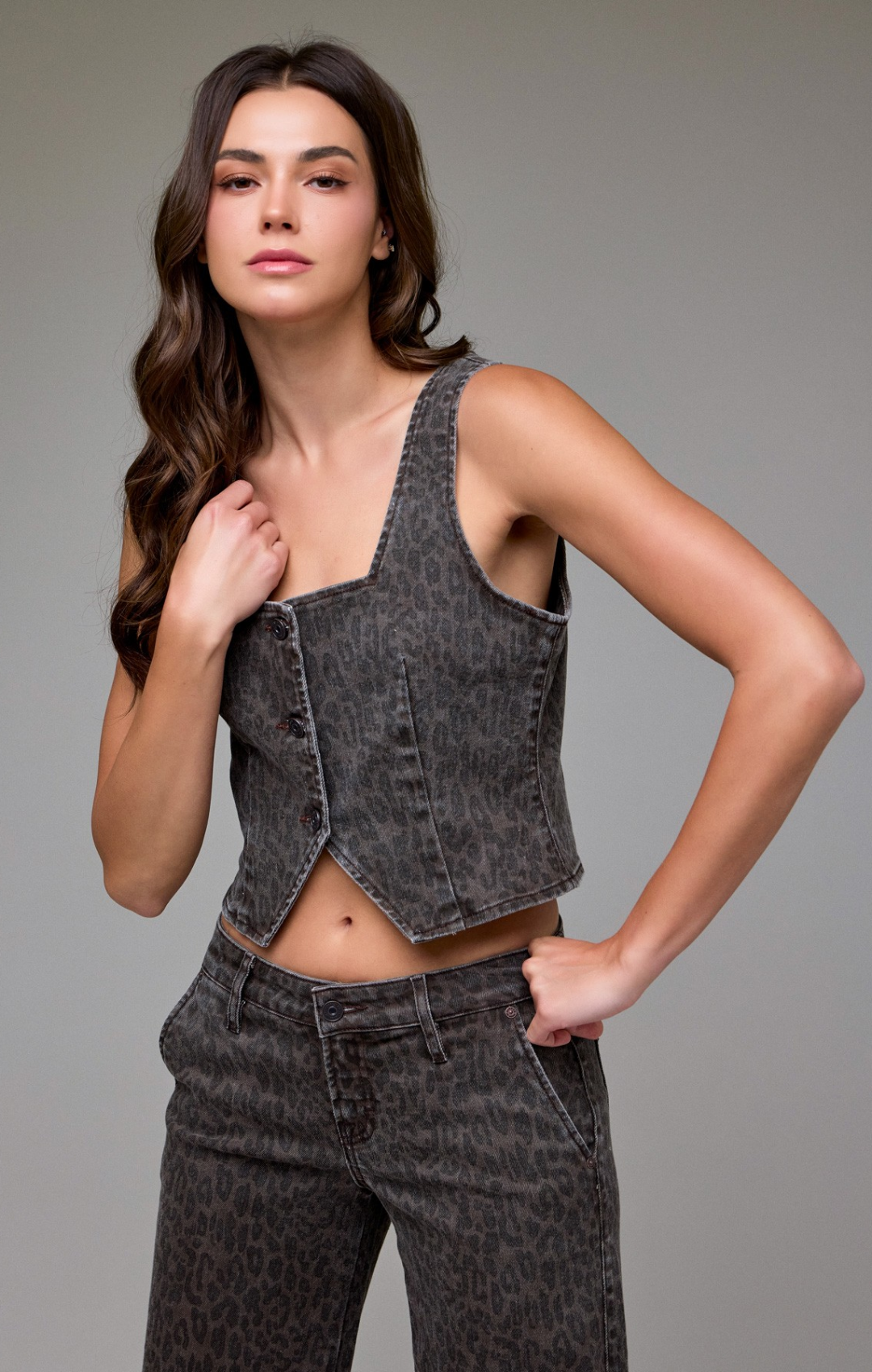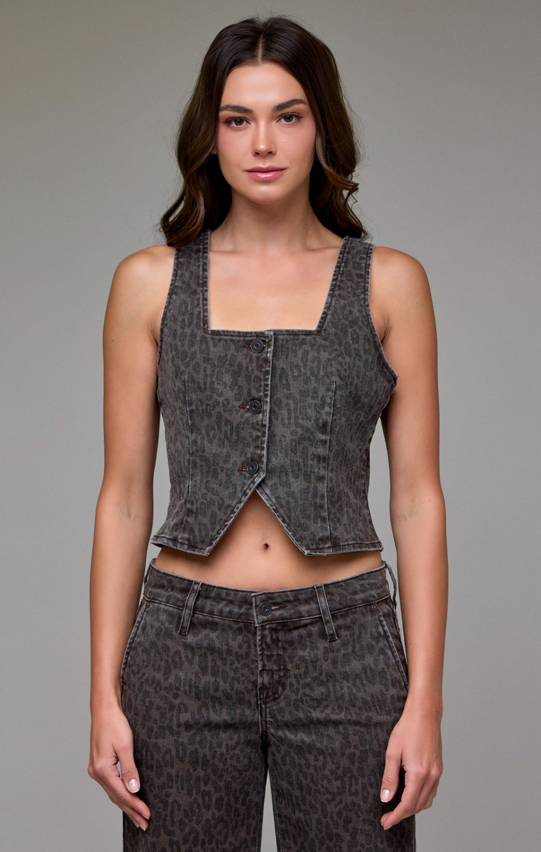 Elevate your style with this Brown Cheetah Vest featuring a chic square neckline. Its bold pattern adds a fierce touch to any outfit, while the tailored fit ensures a flattering silhouette. Perfect for layering or making a statement on its own, this vest brings wild sophistication to your wardrobe.