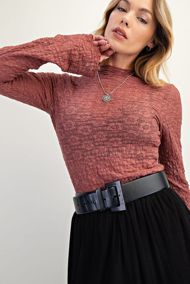 Elevate your wardrobe with this lace fitted top featuring a high neckline accented by delicate ruffled detail. The intricate floral lace pattern adds timeless elegance, while the slim-fit silhouette flatters your shape. Flared cuffs with ruffled trim bring a graceful finish, making this top perfect for both sophisticated occasions and stylish everyday wear.