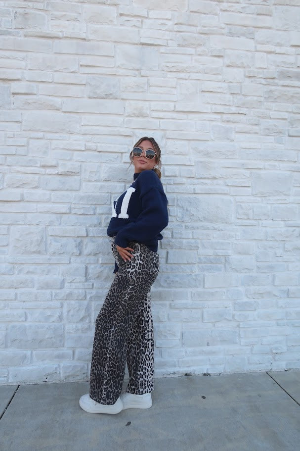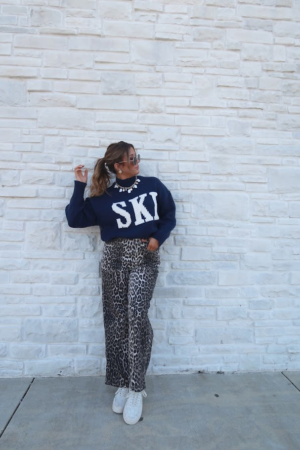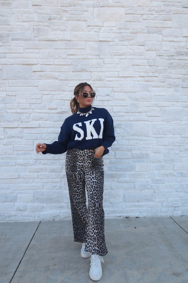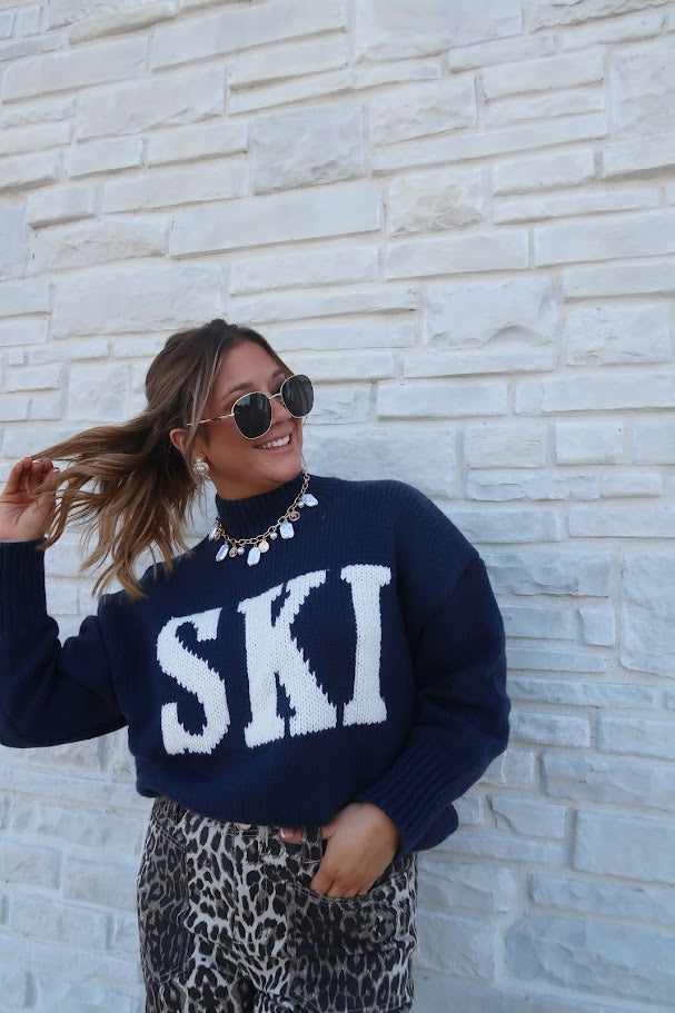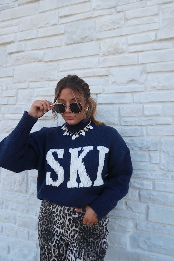 Experience cozy style with this High Neck Oversized Sweater, with the grapic design SKI on the front. The navy sweater and ivory words pair perfect with different colors. Perfect for layering or wearing on its own, this sweater combines comfort and distinctive design to keep you warm and stylish all season long.