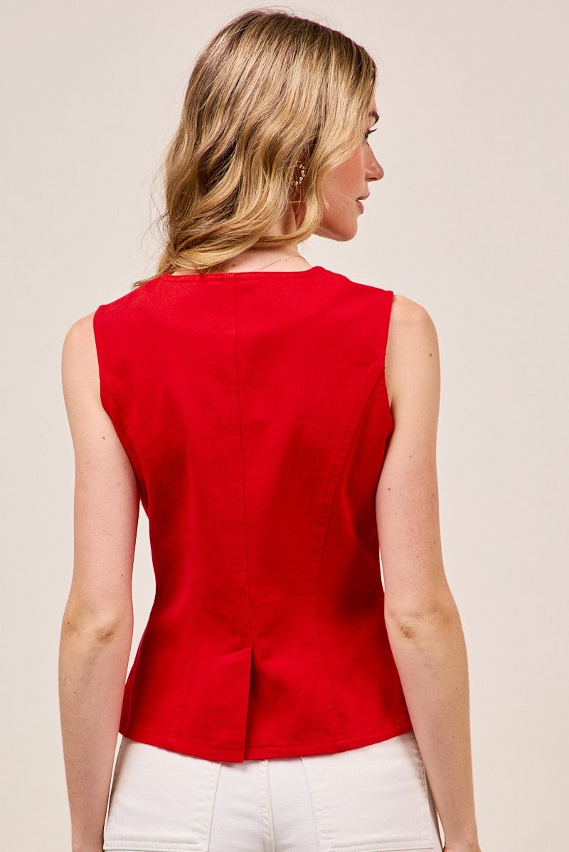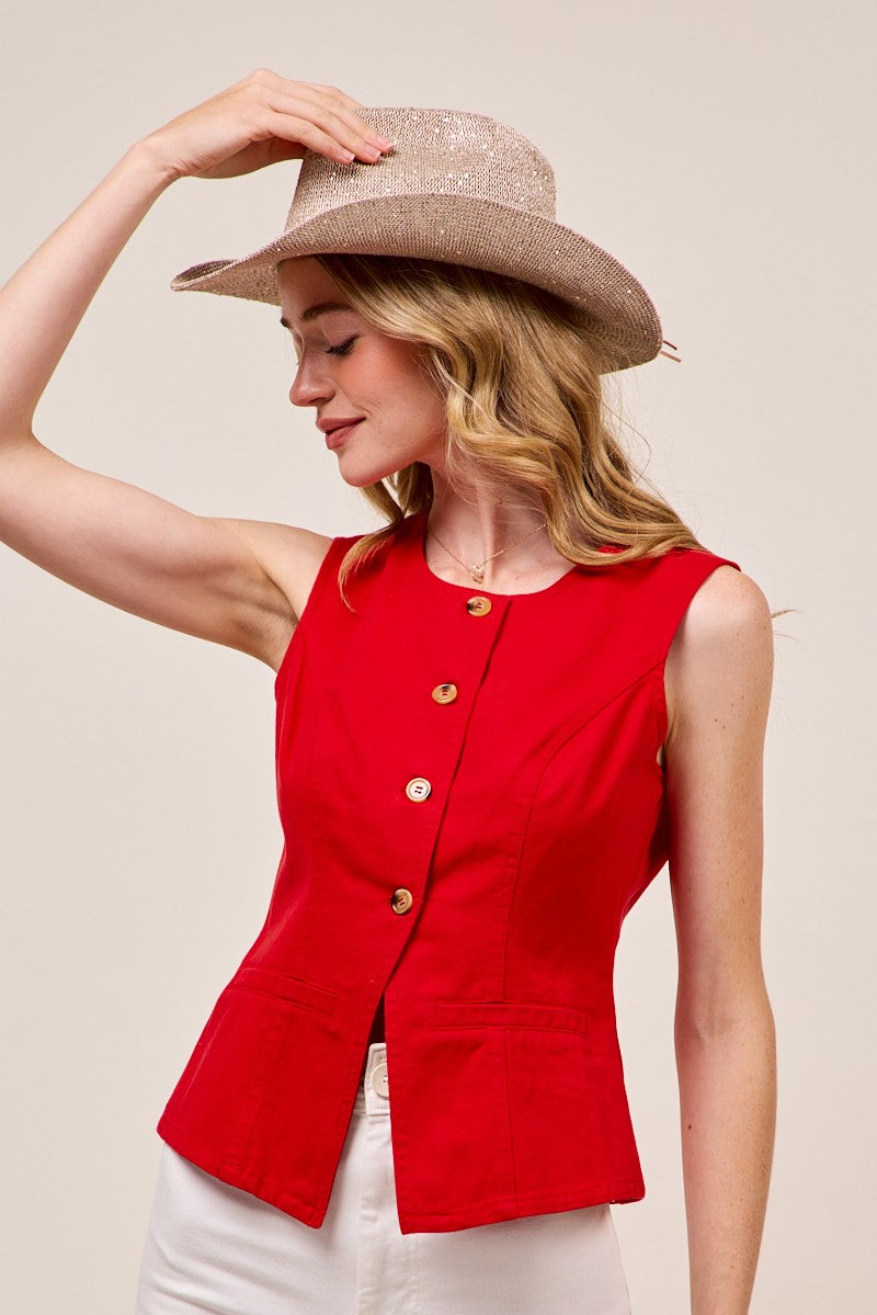 Elevate your game day look with this slim fit button-front denim vest top. Designed to flatter your silhouette, it offers a sleek, tailored fit that pairs perfectly with your favorite team gear. The classic denim fabric adds a timeless edge, while the button-front detail provides easy wear and a stylish finish. Ideal for showing off your spirit in comfort and style.