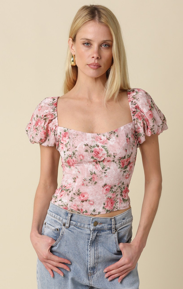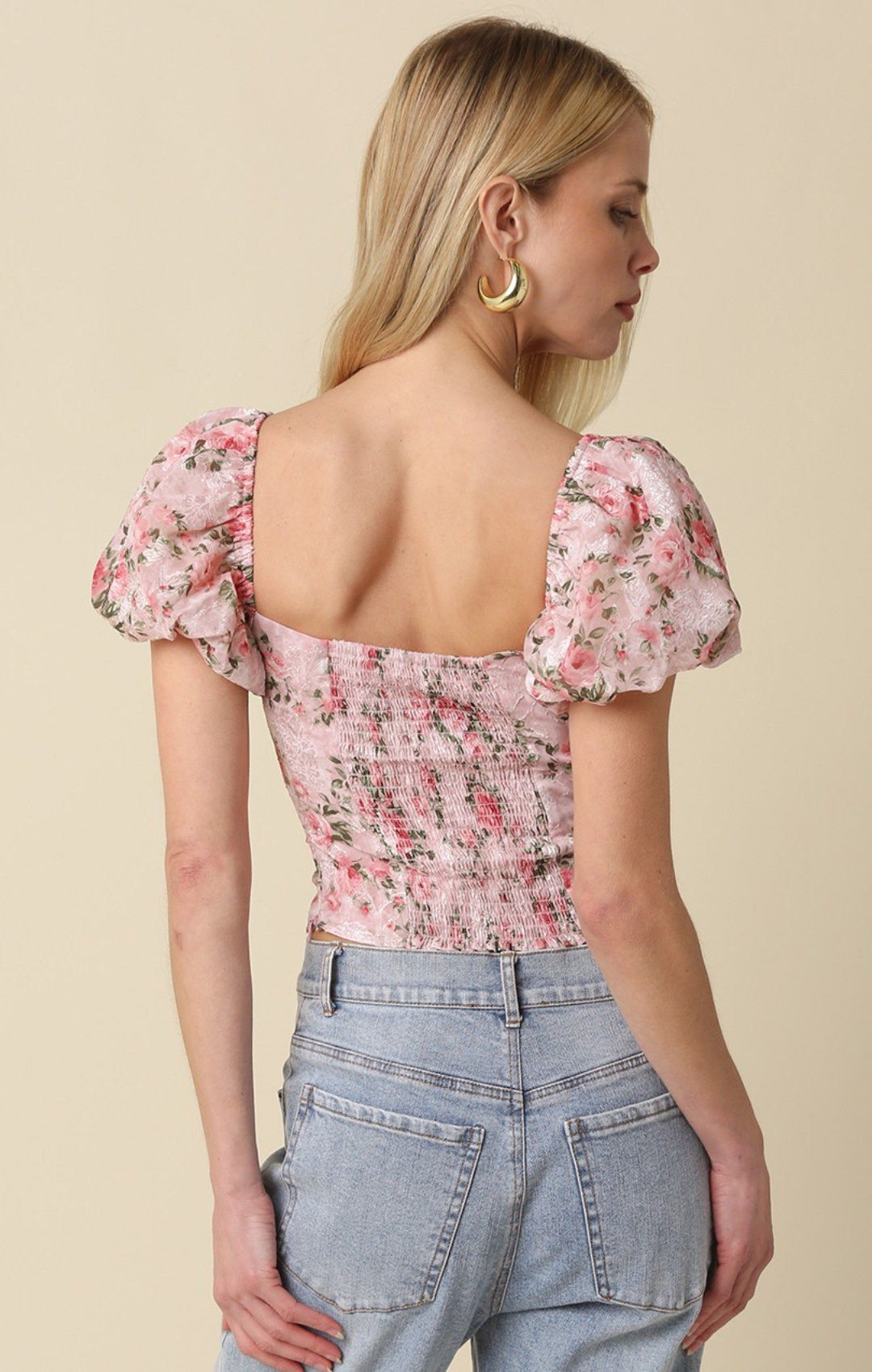 Our Alison Floral Puff-Sleeve Crop Top features a square neckline with ruffled puff sleeves and a smocked bodice with a side zipper closure for a fitted, stretchy silhouette. The Blush Pink color is so eye catching and elegant.