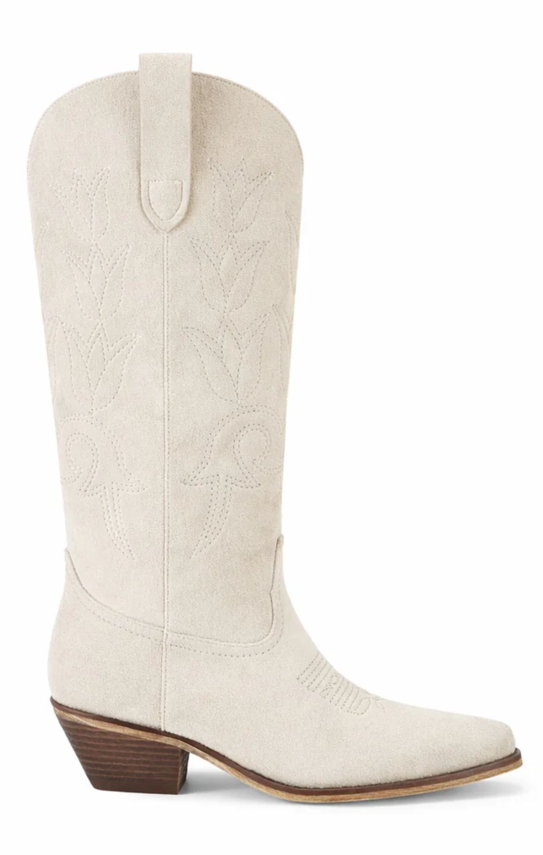 ntroducing The Emmylou in Bone- the perfect boot for every season. Our tall, bone color vegan suede boots are the perfect choice! Made from high-quality material, these boots are both fashionable and durable. The classic western design features a pointed toe and tulip stitching, making them perfect for both casual and dressy occasions.