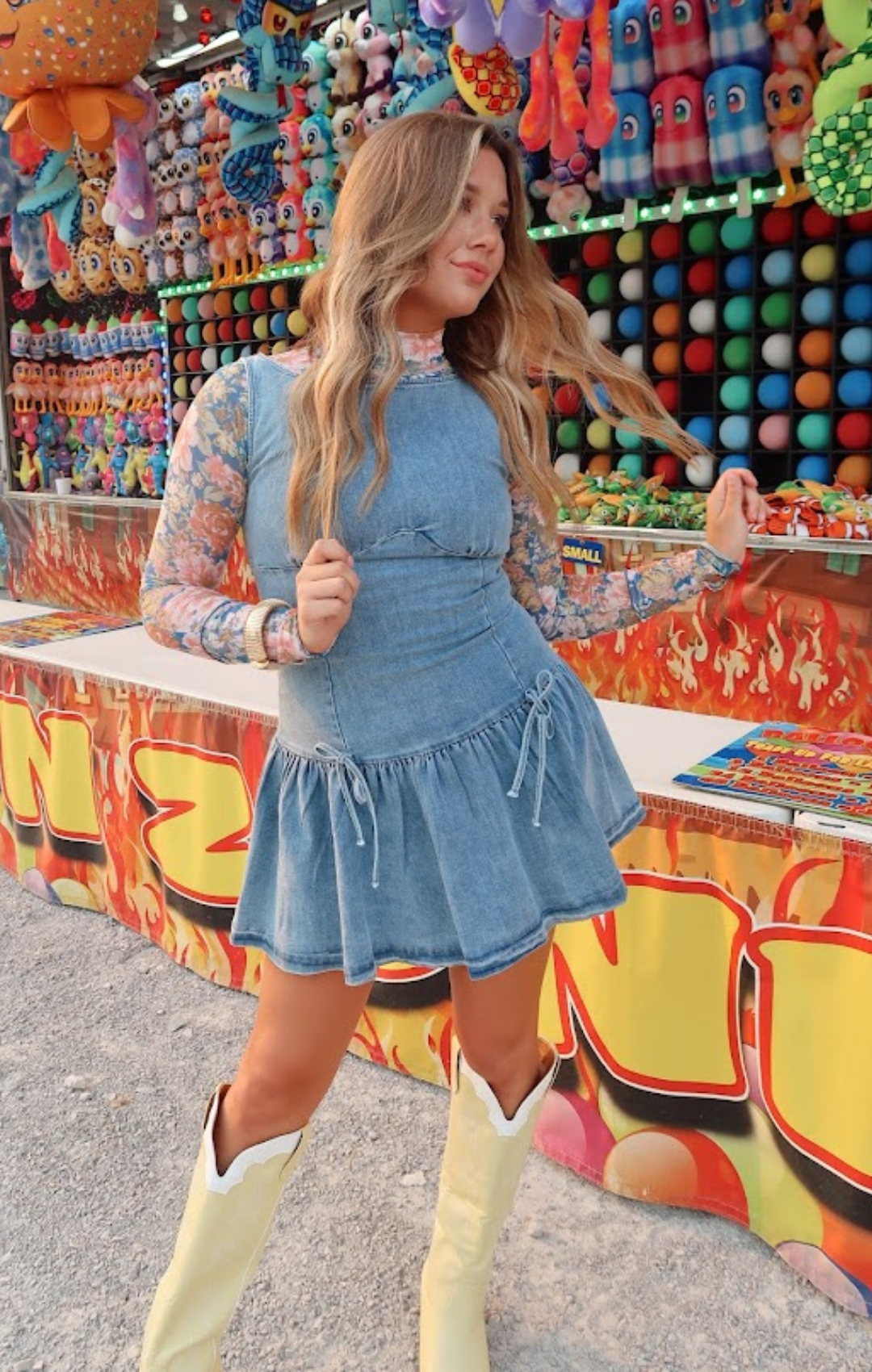 Ali is 5'6" and 140 lbs, wearing a size small. She has a 38" bust, 32" waist, and 40" hips. She typically wears a small in tops and a medium in jeans. (yellow boots)