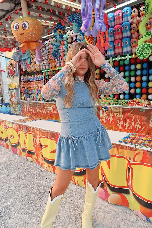 Experience the perfect summer dress with our Bow Fit & Flare Denim Dress. Made from a comfortable denim fabric, this sleeveless dress features a round neckline and fitted bodice for a flattering fit. The ruffled and pleated skirt adds a touch of femininity, while the front ribbon bow details are the perfect finishing touch. With an invisible back zipper closure, this dress is easy to slip on and wear all day long. Look and feel your best in our Bow Fit & Flare Denim Dress.