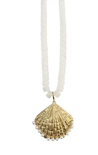 Elevate your look with the Camila white beaded necklace, featuring vibrant hand-strung beads and an 18k gold-plated shell charm with pearl accents by Gemelli. A perfect blend of coastal elegance and everyday style, this statement piece adds a fresh pop of color to any outfit. Ideal for layering or wearing solo.