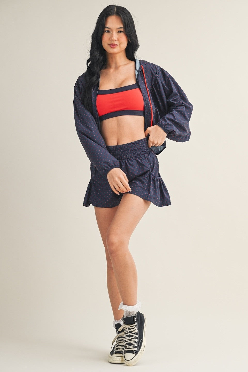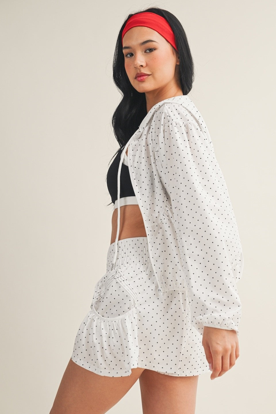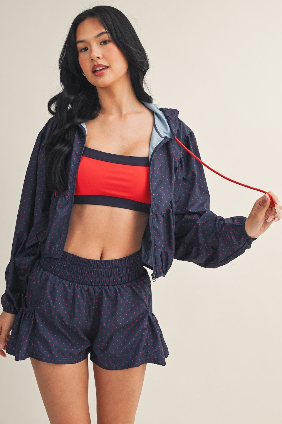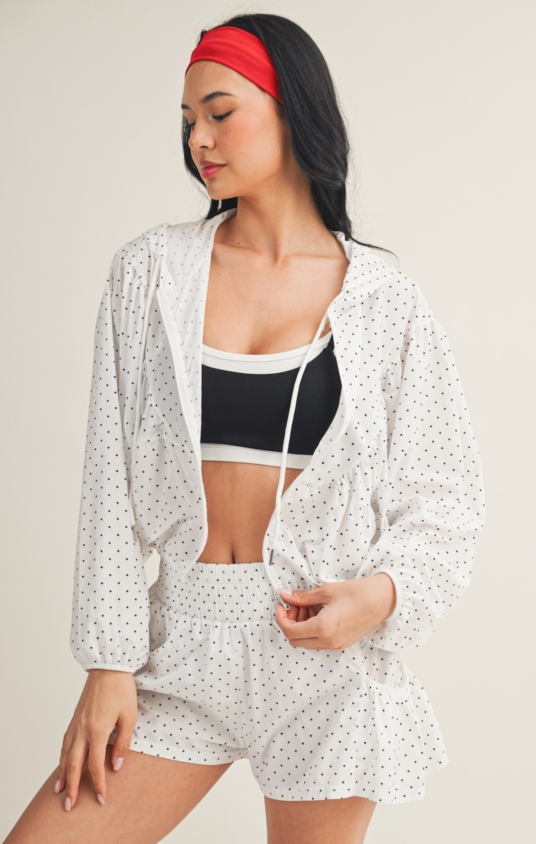 Lightweight windbreaker jacket in polka dot print with a full zip front and adjustable drawstring for a customized fit. Quick-drying performance fabric keeps you comfortable in changing weather. Layer it over anything for instant style and protection.