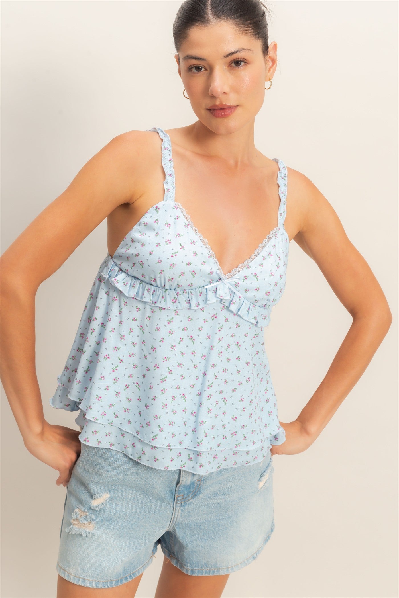 Showcasing a layered floral design, this top features adjustable thin straps and a delicate lace trim along the V-neck. The tiered silhouette creates a graceful flow, perfect for pairing with distressed denim shorts for a stylish summer ensemble. Ideal for boutique owners seeking standout, versatile pieces.