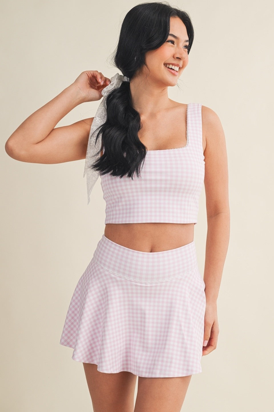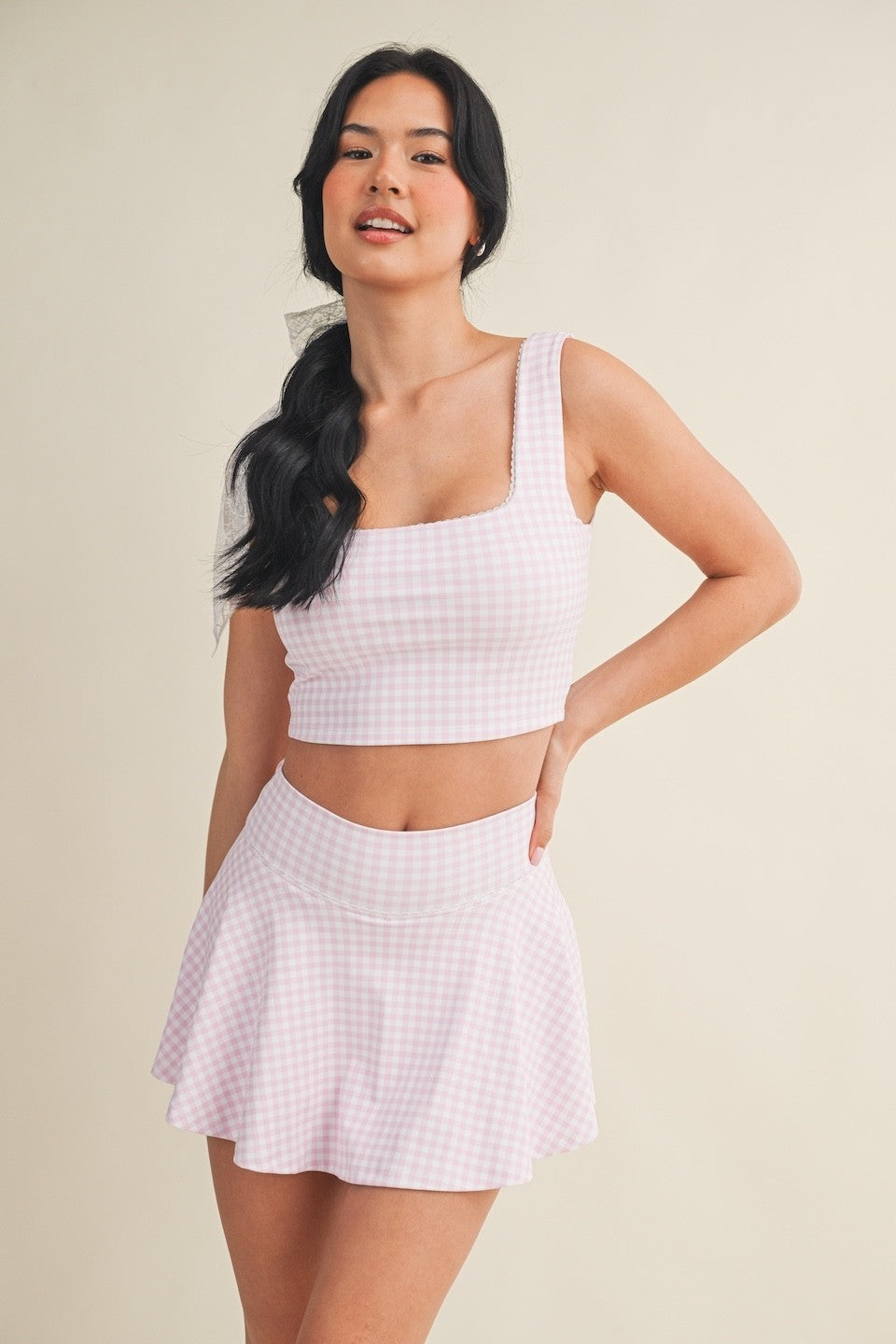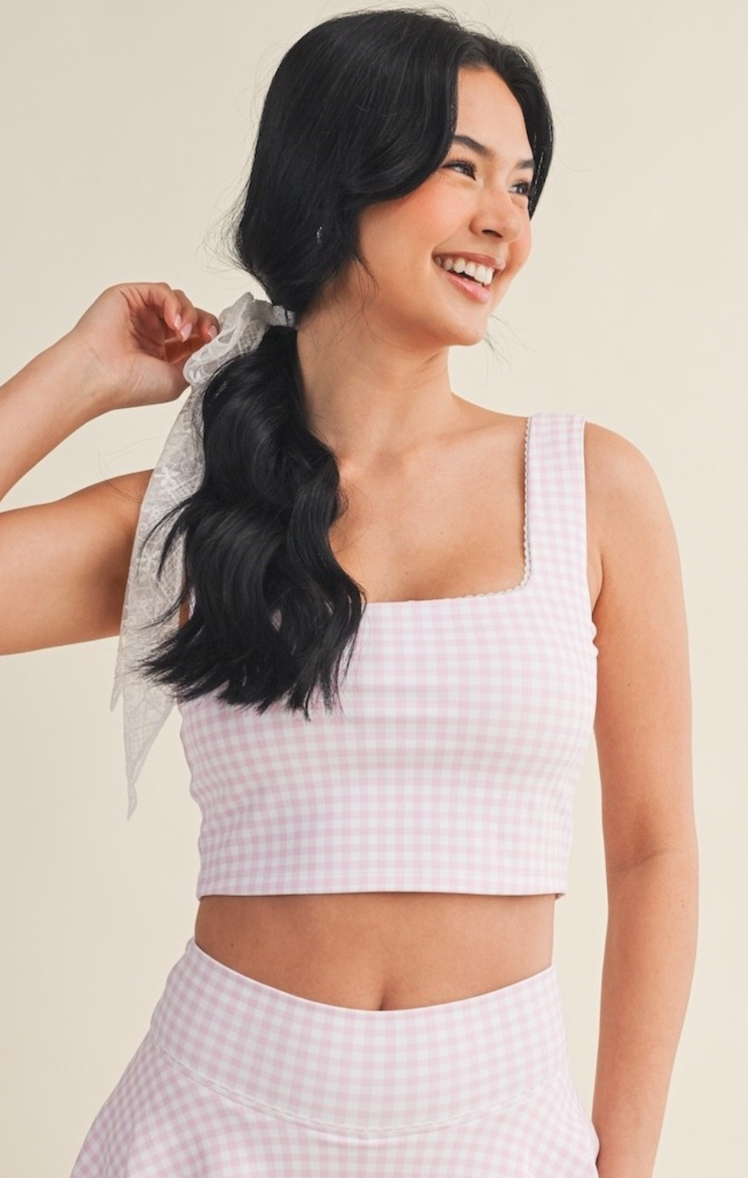 Playful meets feminine in this cropped tank, featuring a classic gingham print and delicate lace trim. Soft, stretchy fabric moves with you, making it perfect for light workouts, lounging, or layering on the go. Flirty, functional, and effortlessly chic.