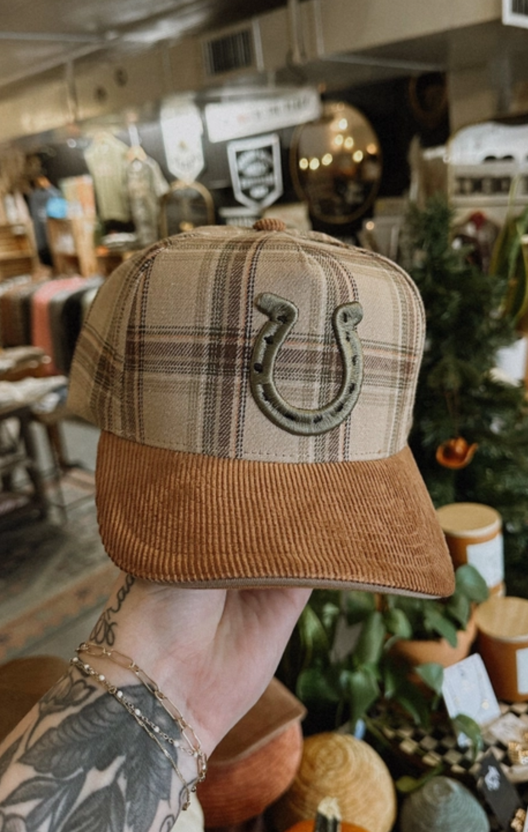Horseshoe Plaid Corduroy Trucker Hat Classic trucker silhouette meets vintage plaid in this corduroy five-panel cap. The structured front panels feature a bold horseshoe plaid pattern in rich, textured corduroy, while breathable mesh panels keep you comfortable all day. Adjustable snapback closure ensures a perfect fit. Ideal for casual outings, road trips, or adding a retro touch to your everyday style.