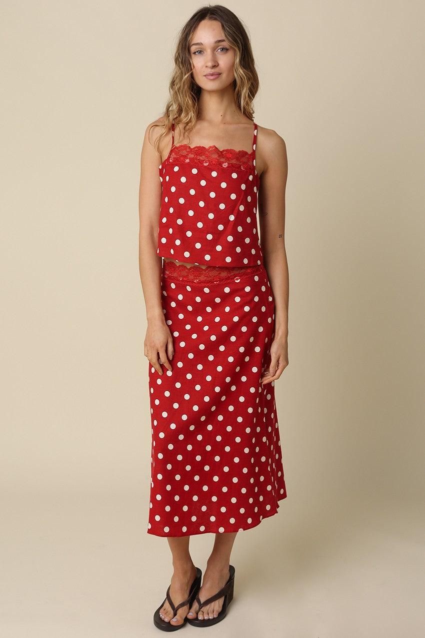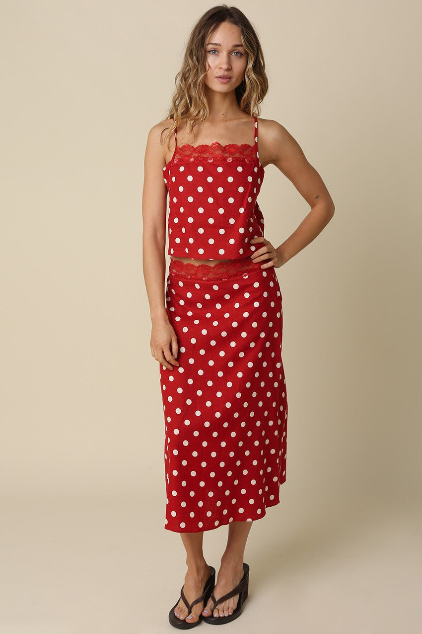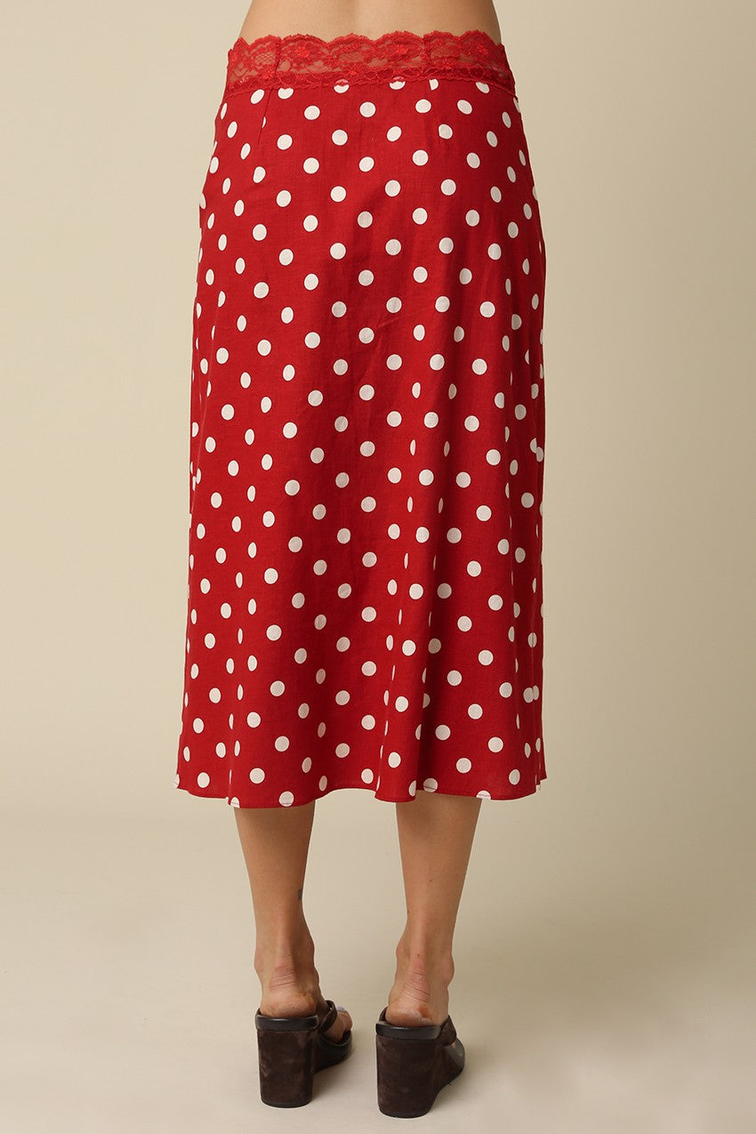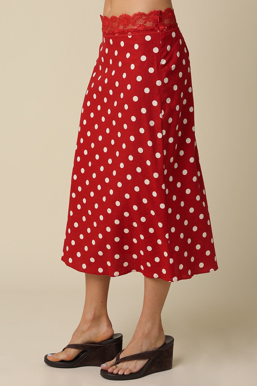 Our Lara Polka Dot Lace-Trim Maxi Skirt features a lightweight linen blend fabric with a flowy maxi length silhouette, and an elastic waistband with delicate lace trim and a side zipper closure for a comfortable yet feminine fit.