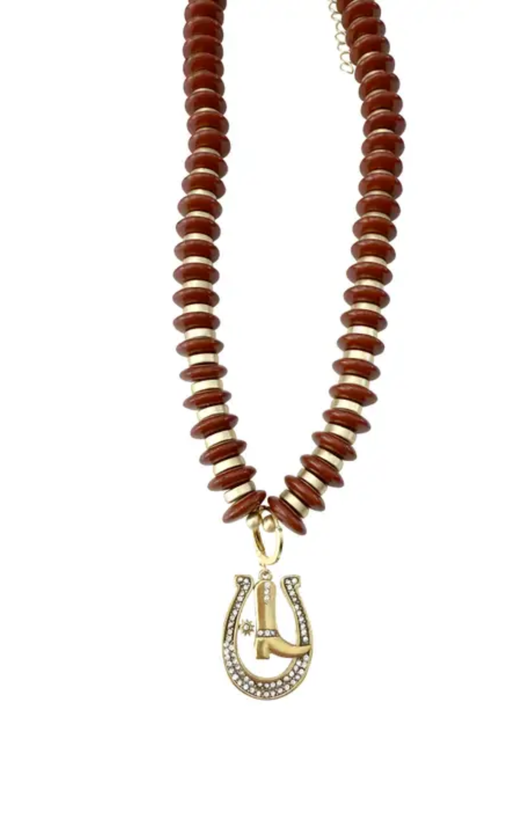 Western flair meets everyday elegance in the Leni necklace by Gemelli. Rich brown beads set the stage for a duo of 18k gold plated charms — a lucky horseshoe and a cowboy boot — both accented with sparkling cubic zirconia. A spirited piece that adds a touch of charm and a hint of country to any outfit.
