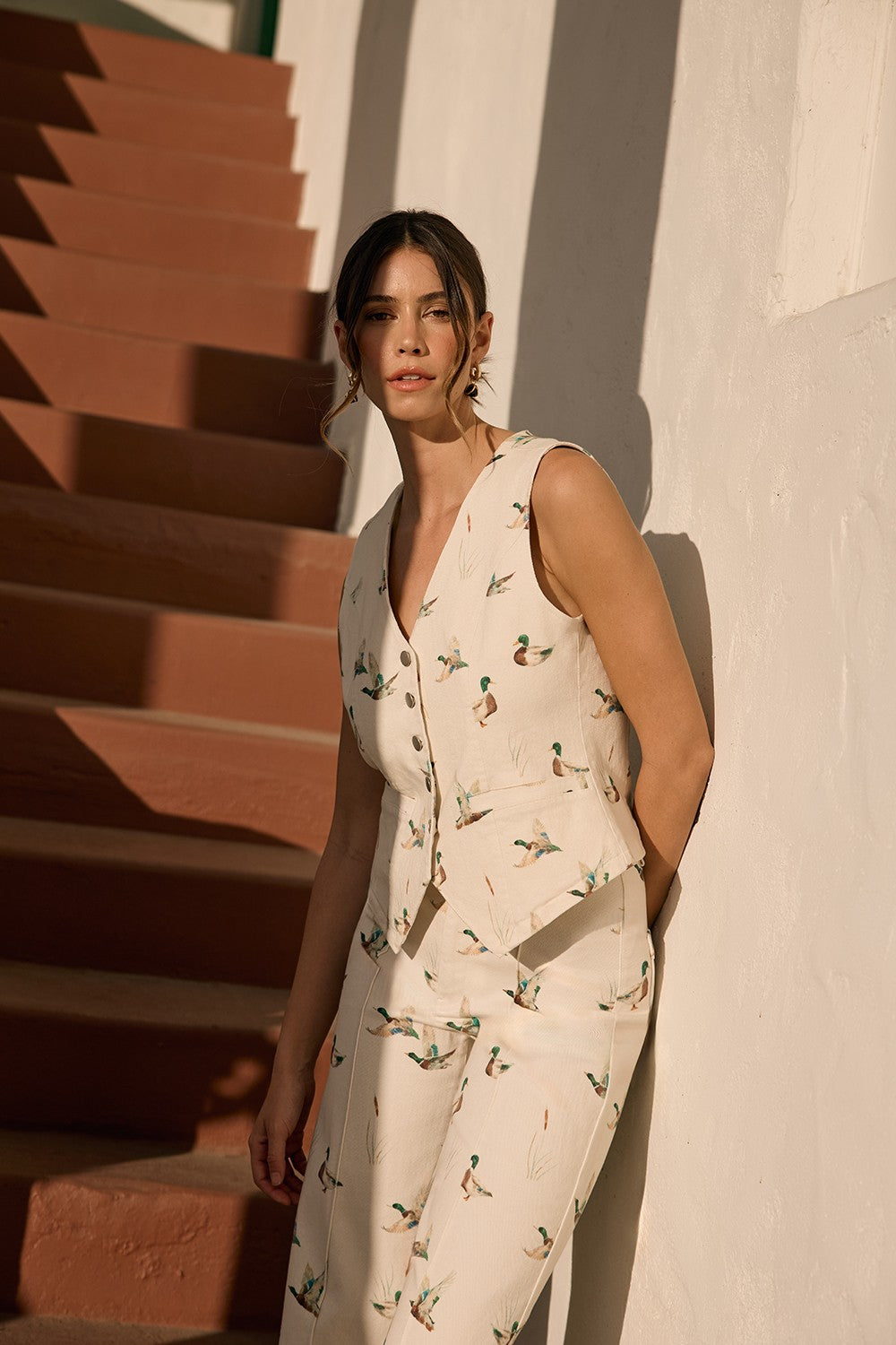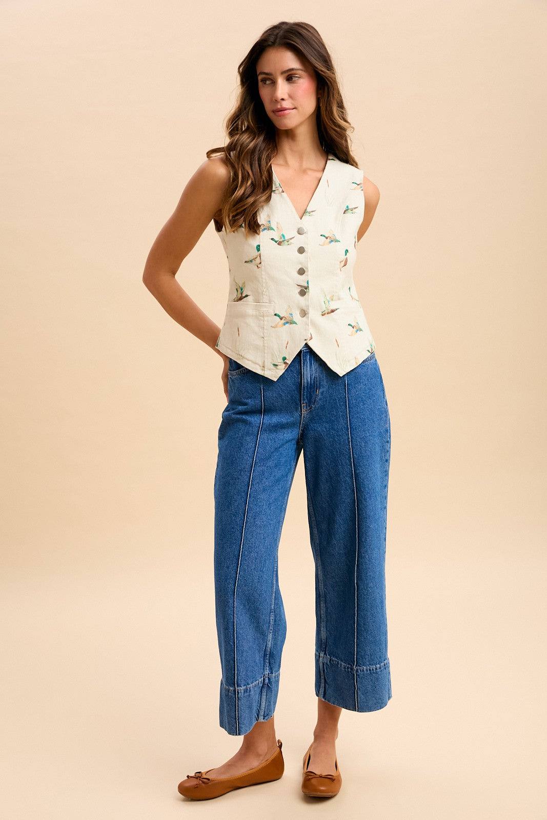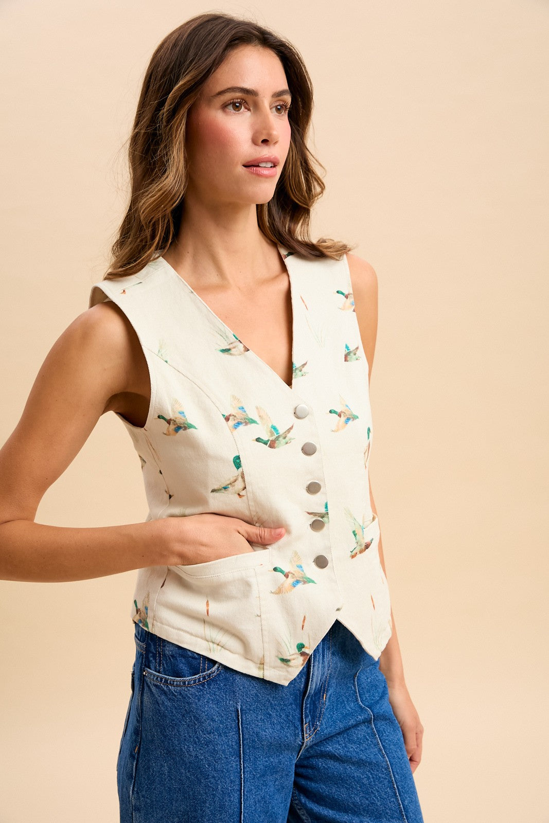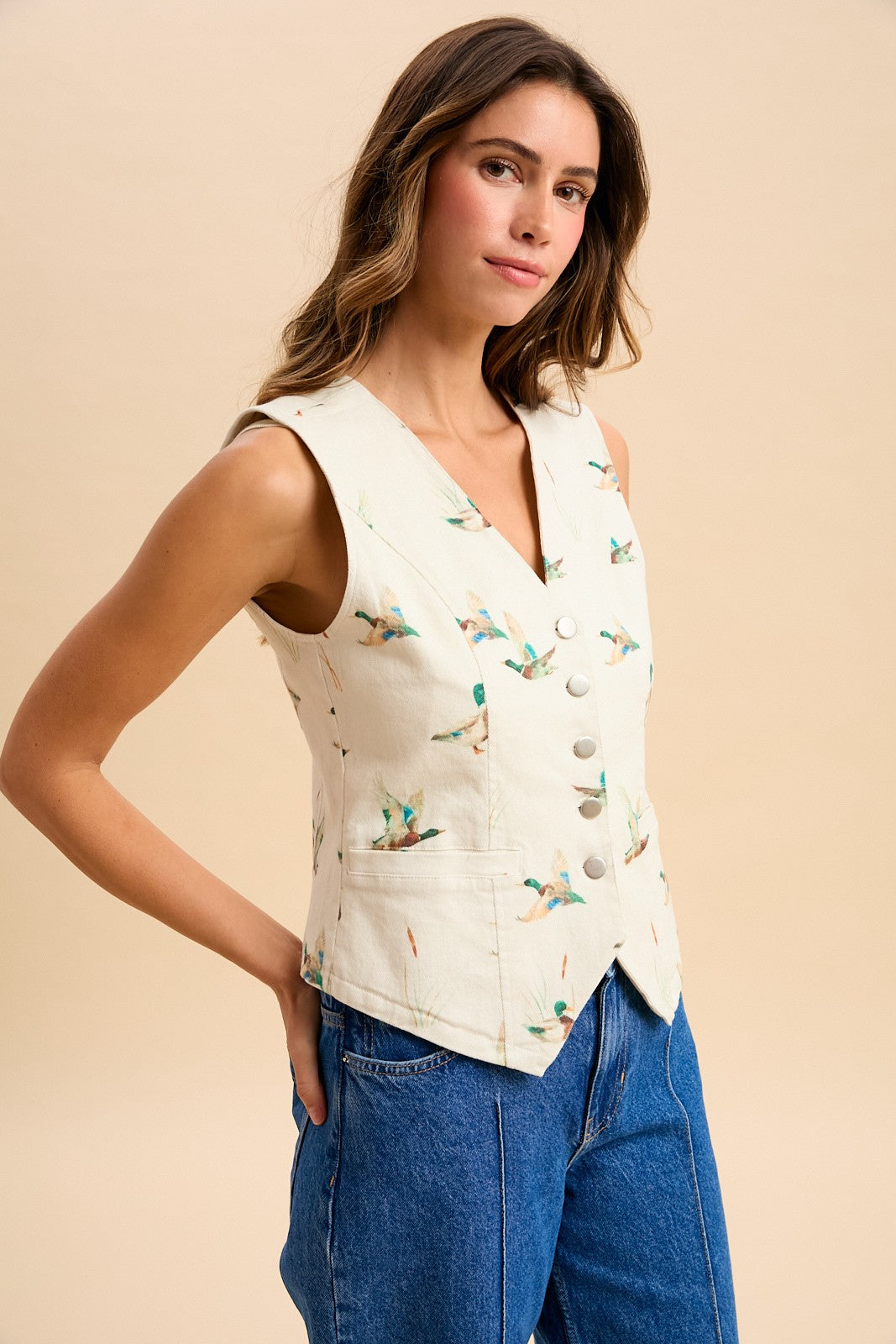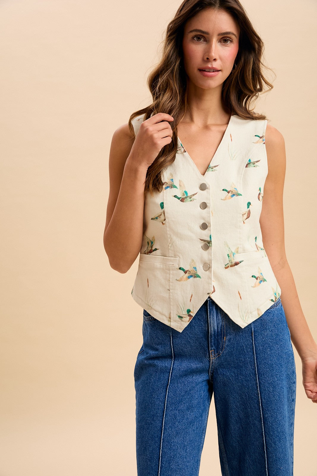 Make a statement with the Mallard Duck Print Cotton Twill Button-down Vest. This structured layer features a distinctive waterfowl print that brings nature-inspired character to your everyday look. Constructed from durable cotton twill with classic button-front closure, it pairs effortlessly with tees, shirts, and sweaters for layered versatility. Perfect for adding dimension to casual outfits or dressing up weekend wear, this vest combines timeless tailoring with contemporary print appeal.