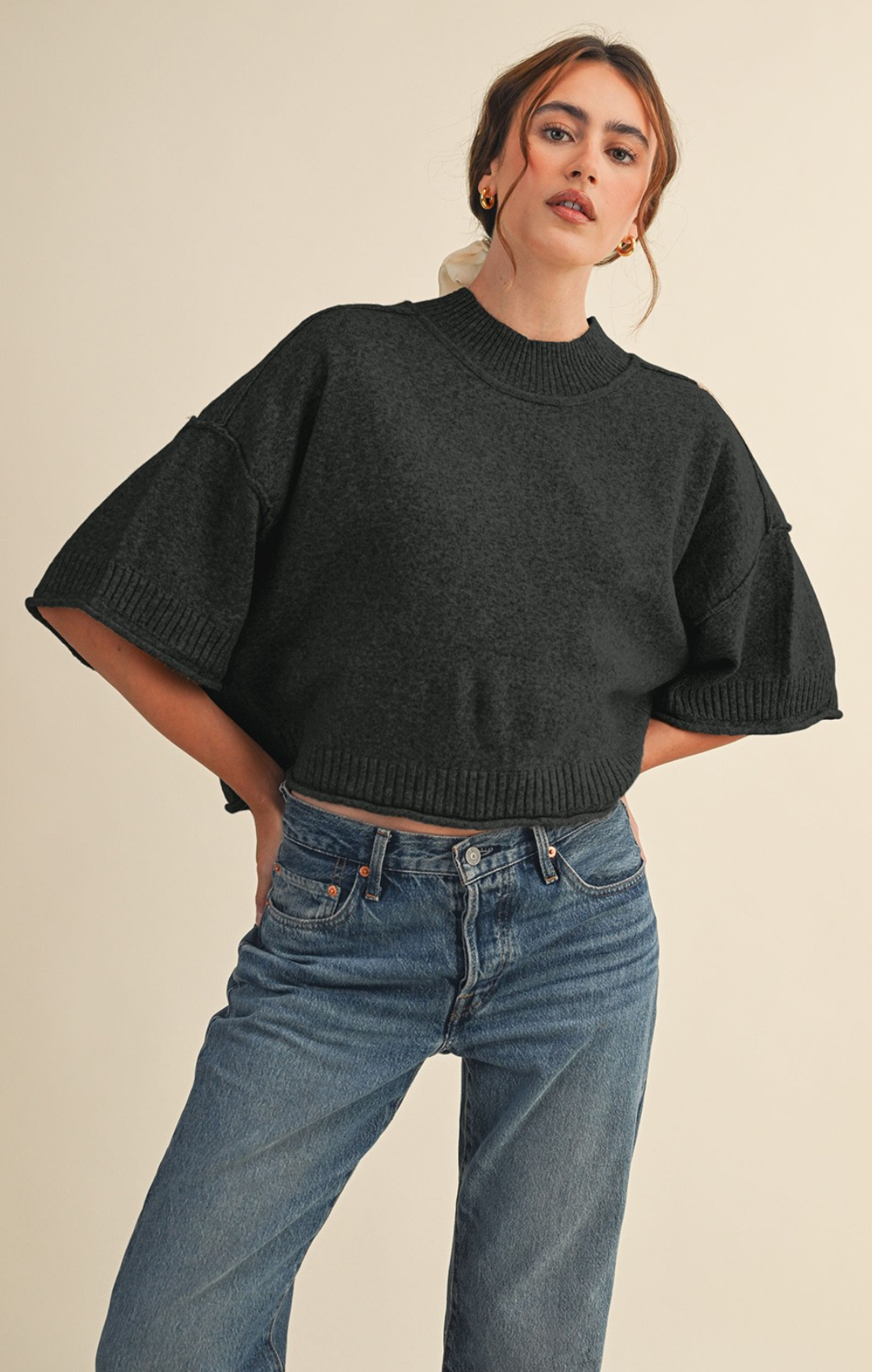 Marled Knit Mock Neck Short Sleeve Sweater