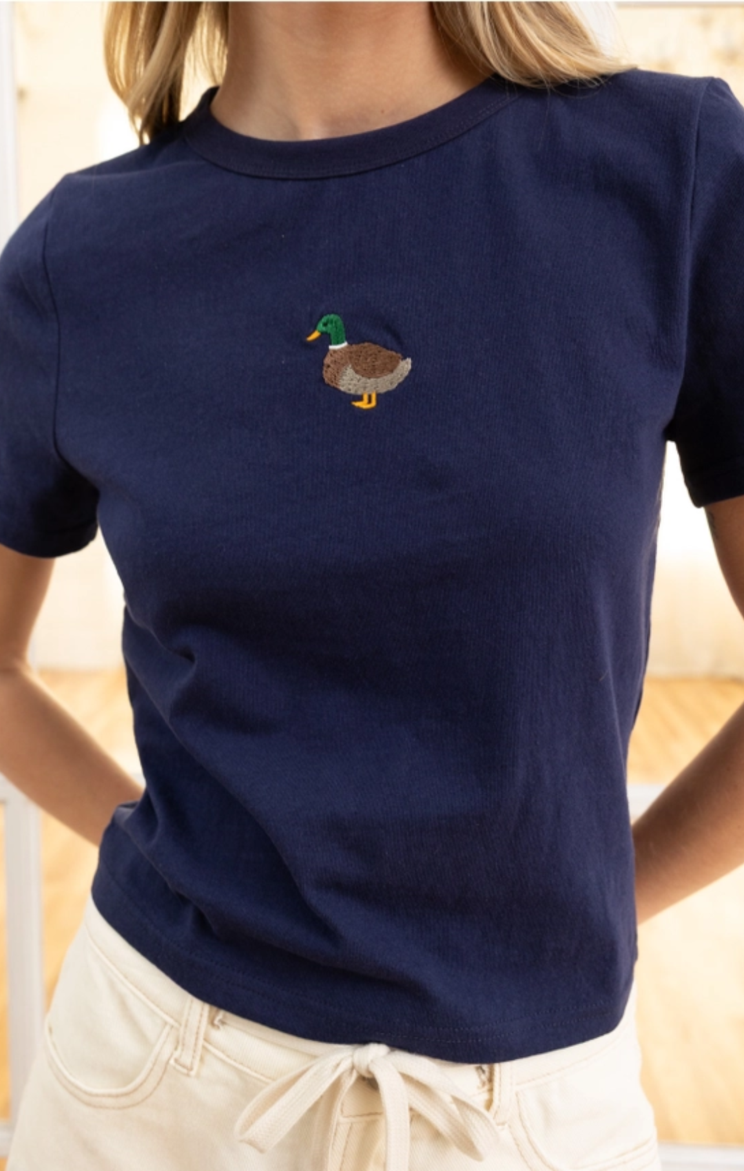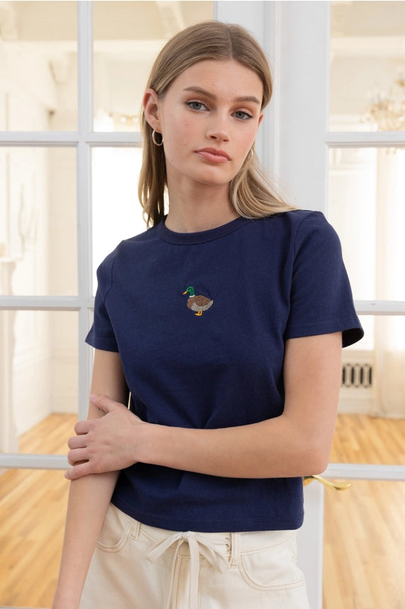 This short sleeve tee features a minimal duck embroidery at the chest, adding a playful yet refined accent.