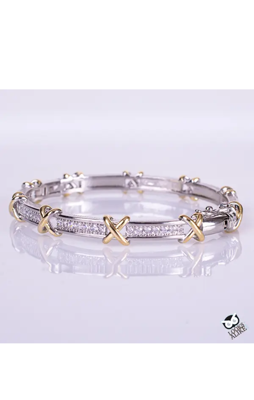 Stunning designer bangle Full cut cz beautiful set, channel style Gold x stations Latch closure with safety clasp Rhodium plated Fits well on medium to large wrists