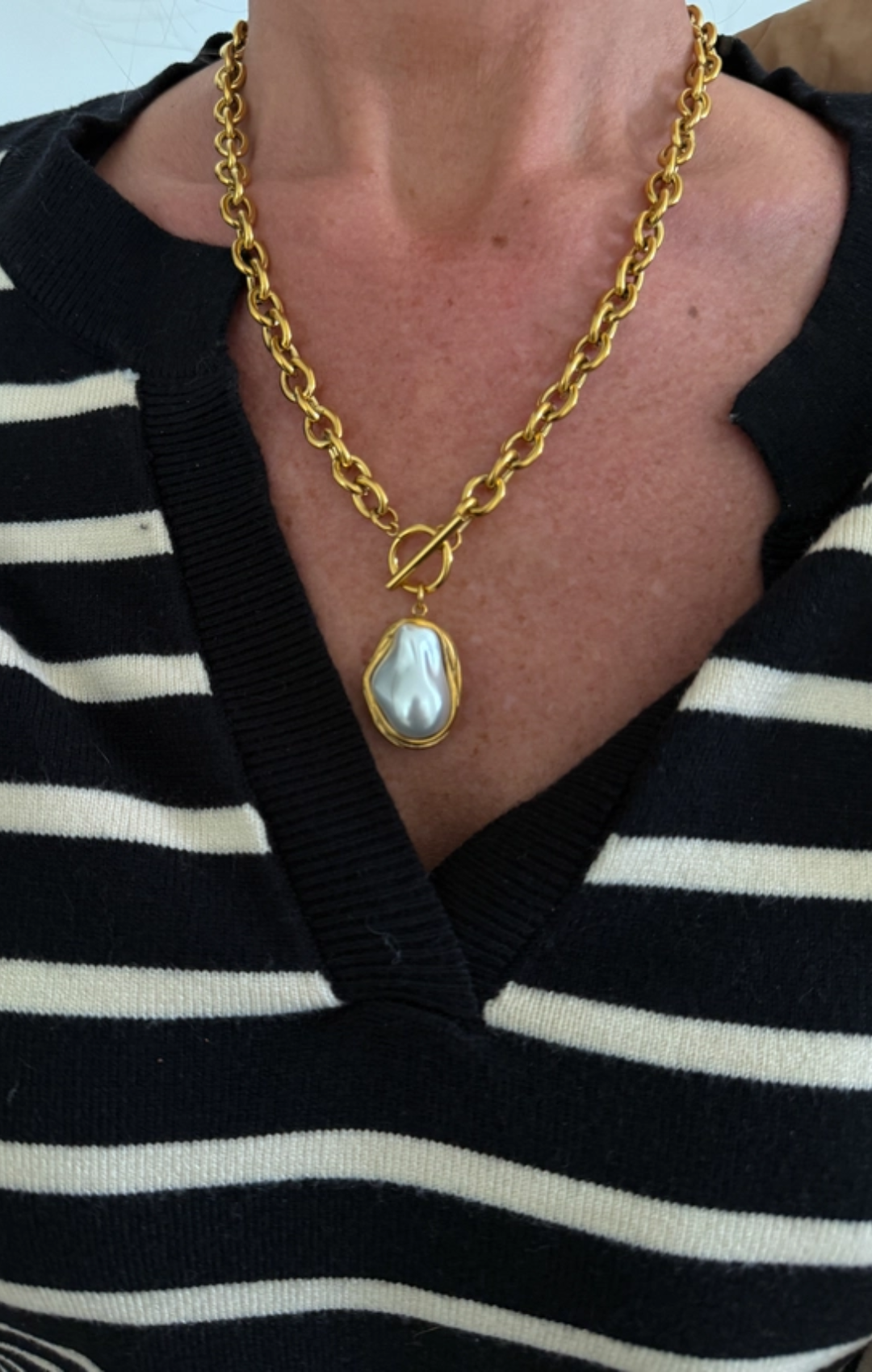 The Pearl Drop Necklace is an 18-inch pendant charm necklace. It's water-resistant and comes with a lifetime warranty.